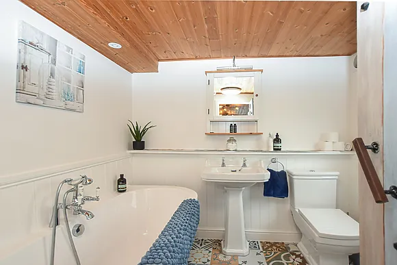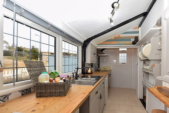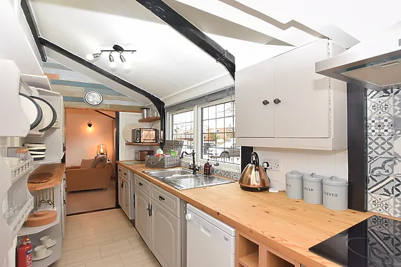 Inside you'll find a sun room with underfloor heating, a spacious lounge with wood burner, a galley kitchen with all mod cons and a double bedroom with river views. The bathroom features a claw-foot bath and separate shower. Outside there's decking, a lawn leading to the river and parking for two cars. An outhouse houses laundry facilities and bike storage.