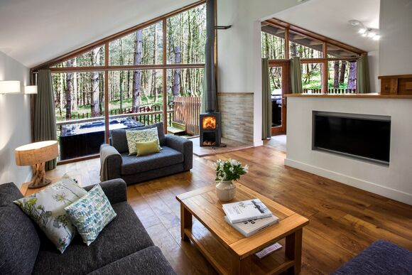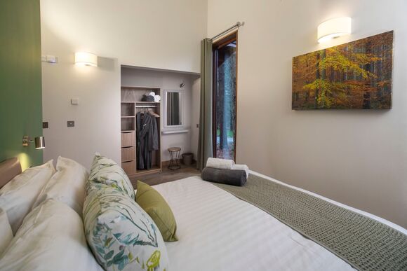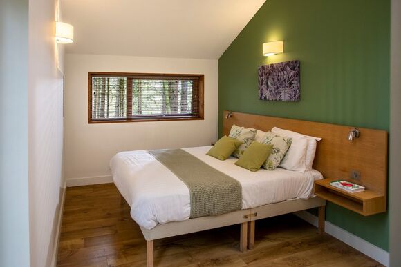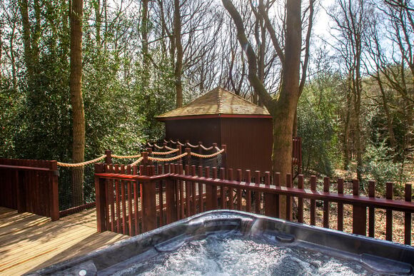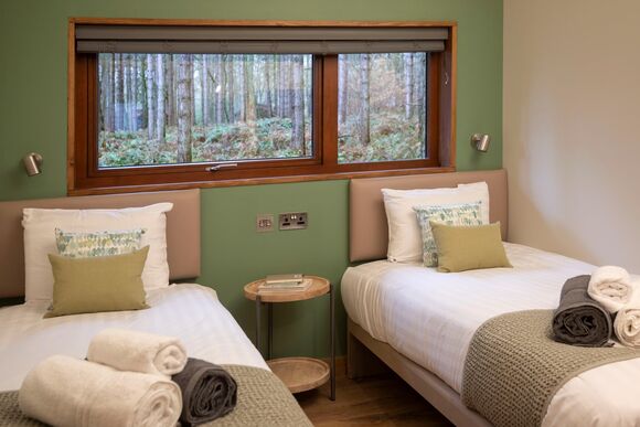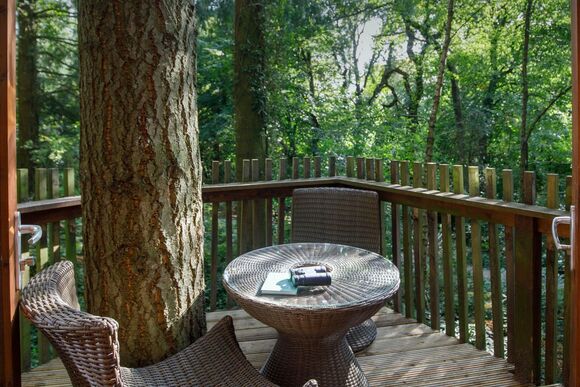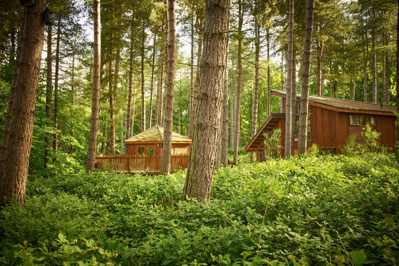 The main 4-bed cabin offers two doubles and four twins over two floors, while the separate treehouse pod has a cosy double with spectacular forest views.