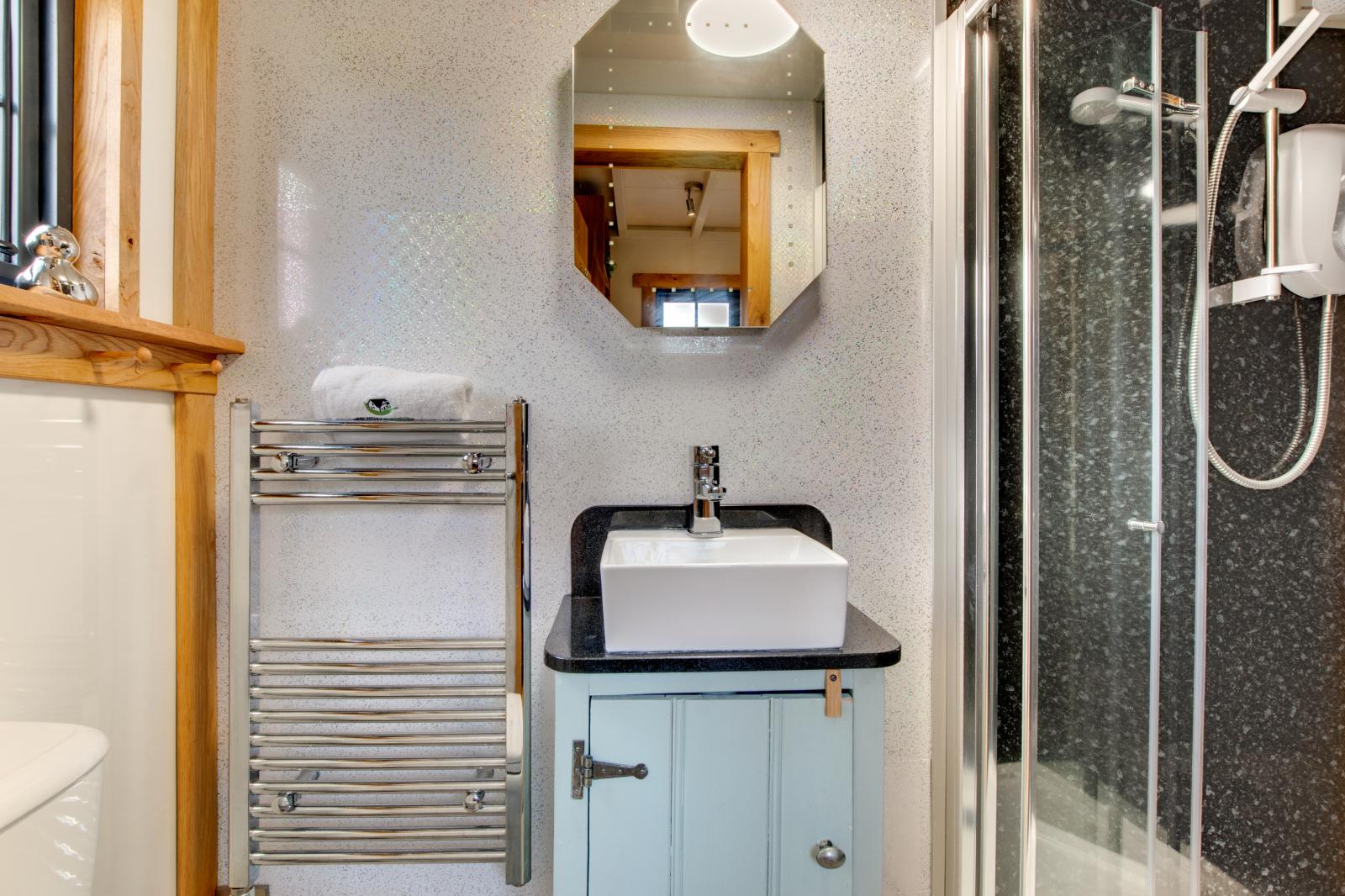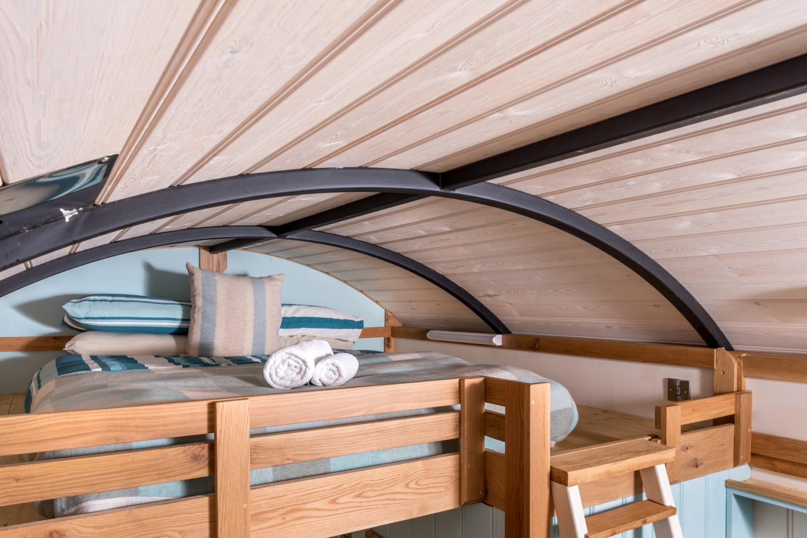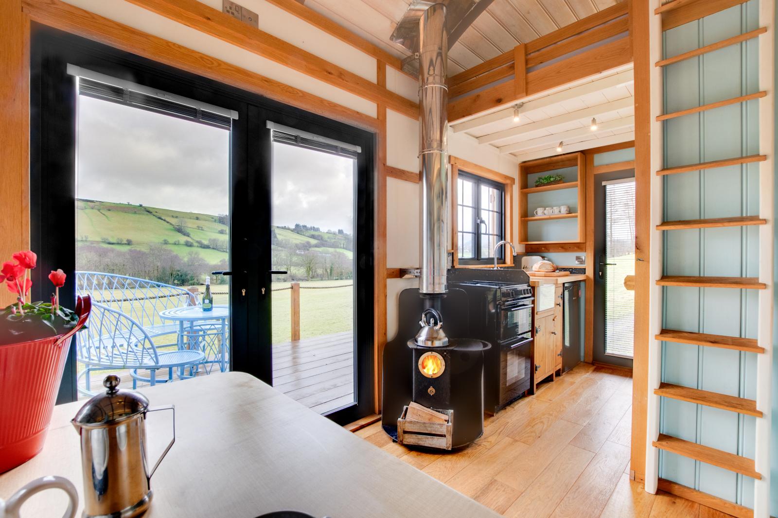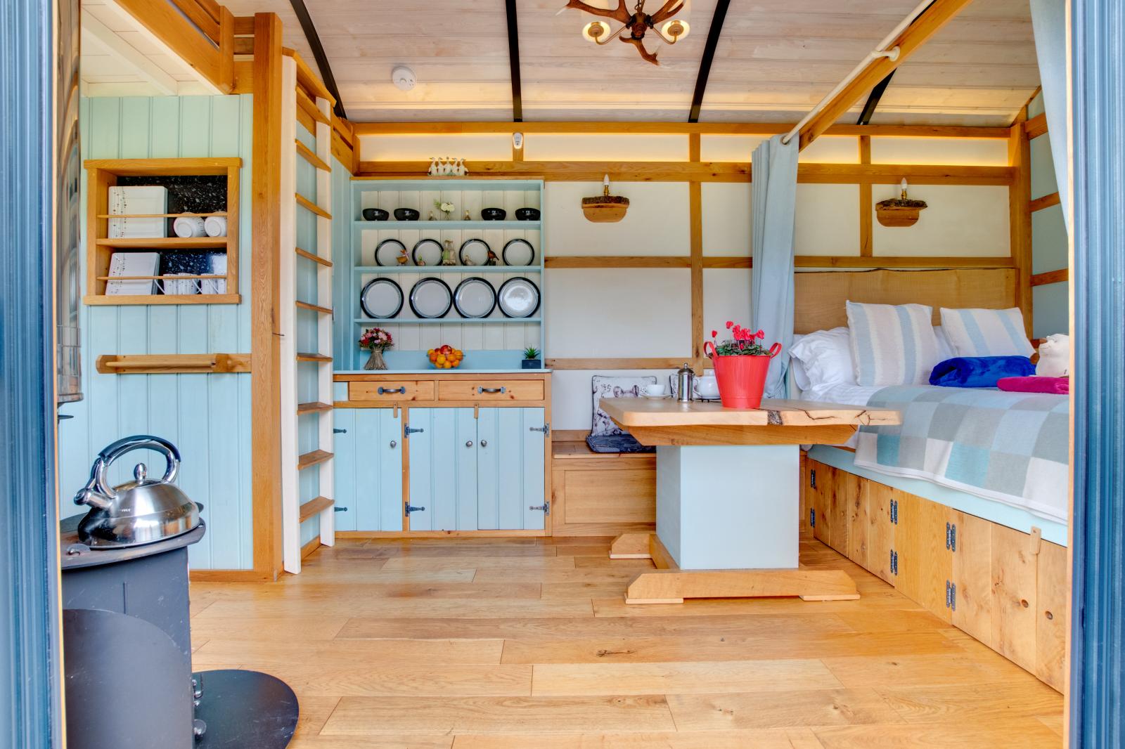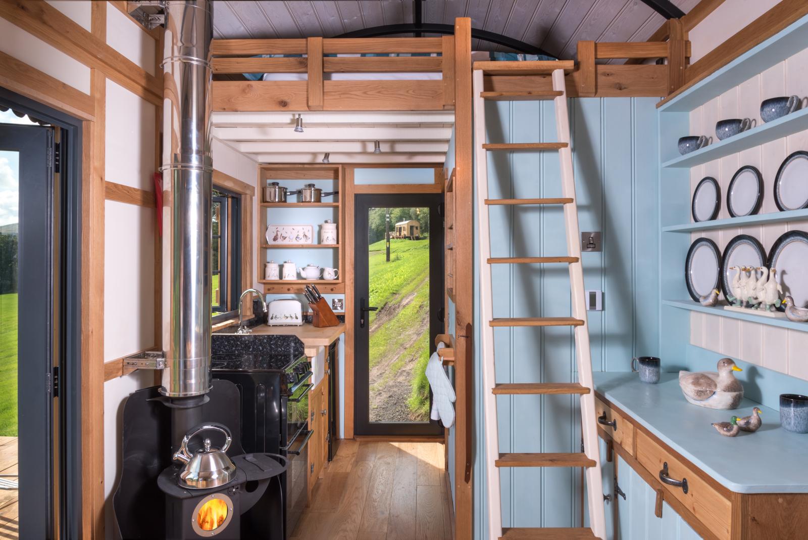 The cabin’s open-plan layout is ingeniously designed to maximize space and comfort. The interior showcases natural materials, creating a bright and welcoming atmosphere. A king-size bed offers field views, while the kitchen and dining area feature fold-away furnishings and a wood burner. The loft, accessible by ladder, provides additional sleeping space for older children. A stylish bathroom with a full-sized shower ensures your stay is as comfortable as possible.