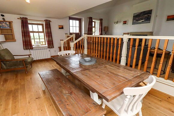 The cottage sleeps across three bedrooms: a ground-floor double, a twin with en-suite and a twin room. It has two bathrooms plus a kitchen, dining area and outdoor patio. The car parking is off-road and this property is pet-friendly.