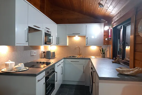 Inside you'll find a stylish modern interior with open-plan living space. Three bedrooms sleep six comfortably - one king-size with en-suite and two twins. The kitchen has everything: oven, microwave, fridge, freezer and dishwasher. Two Smart TVs and a Bluetooth speaker keep everyone entertained.