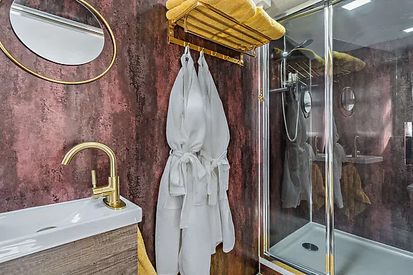 The kitchen's combo microwave and induction hob are ideal for whipping up meals. And after you get out of the hot tub, you'll find plush bathrobes on standby.