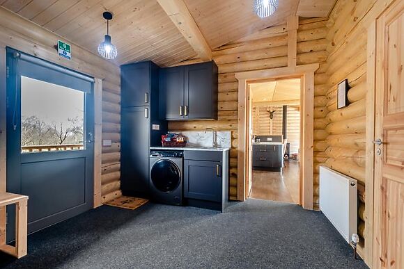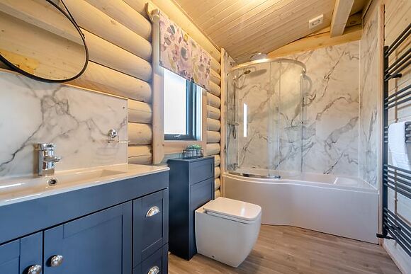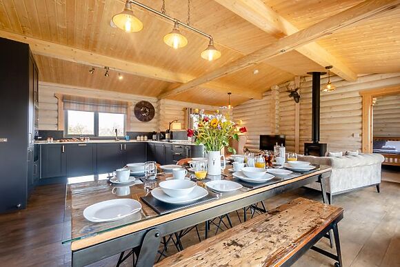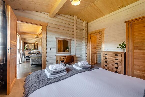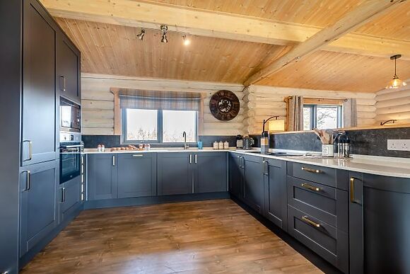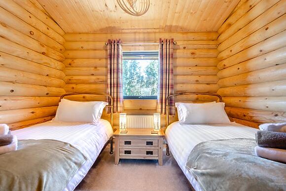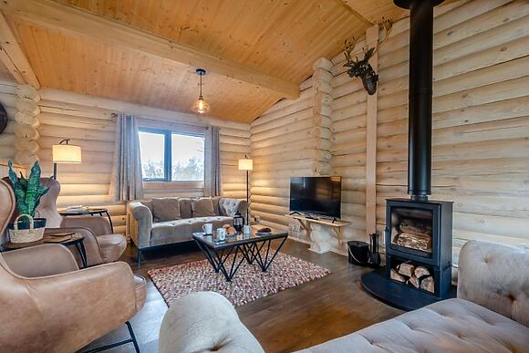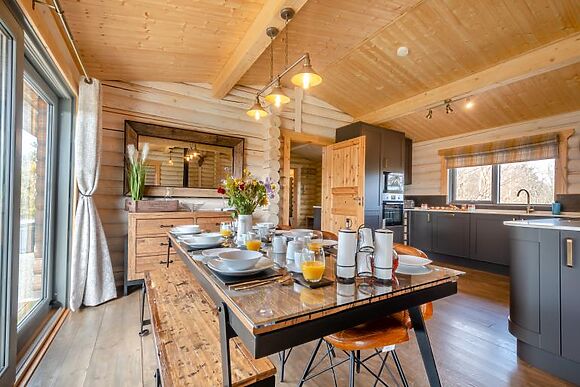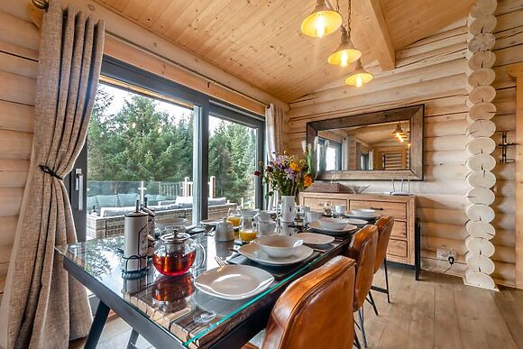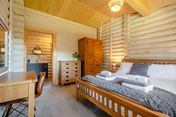 The cabin features a king-size master bedroom with en-suite, a double bedroom and a twin room. The open-plan living area includes a fully-equipped kitchen and a lounge with wood burner. Sliding doors open to spectacular forest views. Outside you've got a BBQ grill cabin that makes for some great nights with friends or family.