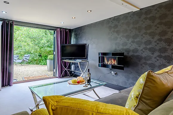 The open-plan lounge and kitchen area seamlessly combine to create an inviting space. Here, a 40' flatscreen TV with DVD and Freeview promises entertainment, while the integrated oven and hob, microwave, fridge/freezer, Tassimo coffee machine, washing machine, and dishwasher cater to your every need.