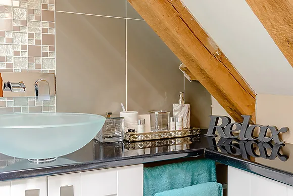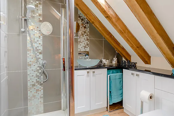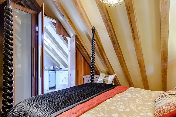 Now, let's explore the heart of this idyllic retreat. The cozy converted barn exudes superlative style, offering a haven of comfort and sophistication. Ascend the staircase from the lounge to discover the romantic double bedroom, adorned with a four-poster bed, and an en-suite shower room and WC concealed within the wardrobe.