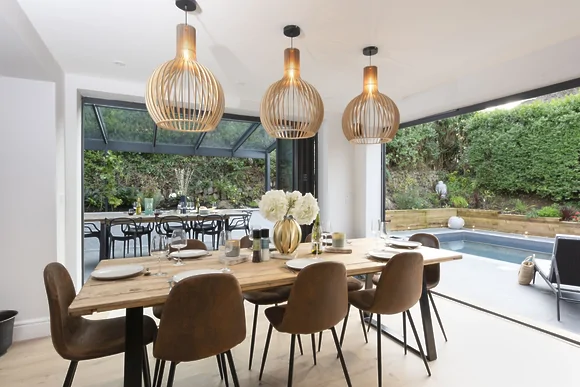 • Dining room with industrial timber table seating eight