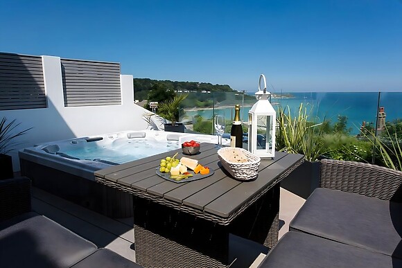 There's really only one thing you can say when you arrive at this lodge and see the views: WOW! One Atlantic Watch is a Gold Award luxury home that you'll find in Carbis Bay, Cornwall. This reverse-level property offers breathtaking 180° ocean views and is just minutes from the popular Carbis Bay Beach. Watch dolphins while sipping wine from your own balcony. Even better - see it all from your own private hot tub.