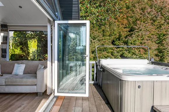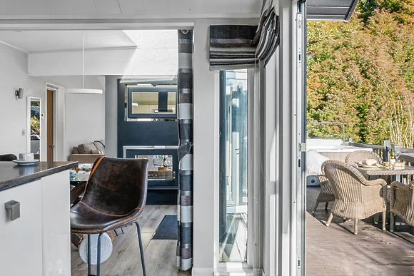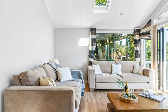 Inside you'll find an open-plan living space with Smeg kitchen appliances and bifold doors to the terrace. The master bedroom features a king-size bed with garden views and en-suite shower. The second bedroom has twin beds (configurable as double) with its own en-suite featuring a freestanding bath with waterproof TV. Both rooms have Freeview televisions.