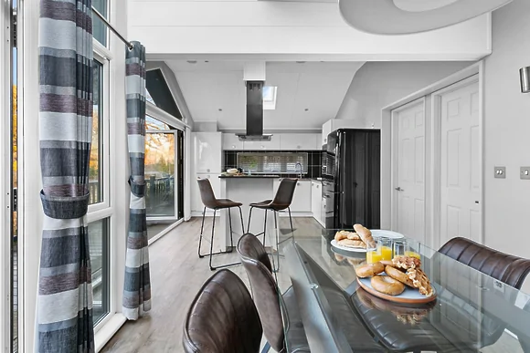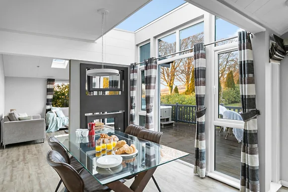 Inside you'll find an open-plan living space with Smeg kitchen appliances and bifold doors opening onto the deck. The master bedroom has a king-size bed with en-suite shower whilst the second bedroom offers twin beds (can be configured as double) with a freestanding bath and waterproof TV. Both rooms have Freeview televisions and built-in wardrobes.