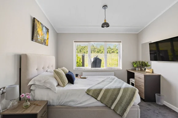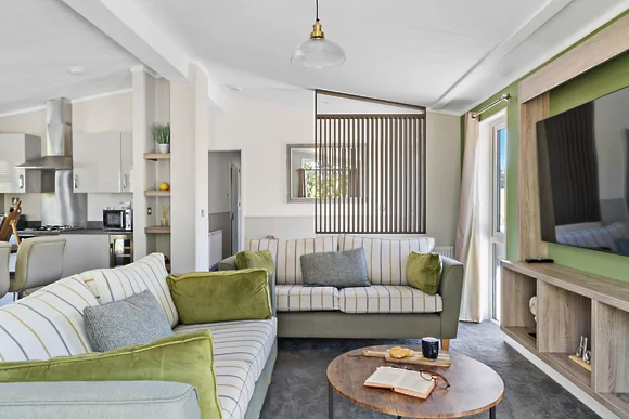 Inside you'll find a master bedroom with en-suite walk-in shower, plus two twin bedrooms sharing a family bathroom with bath and separate shower room. The modern kitchen boasts a five-ring gas hob, wine cooler and central breakfast bar. Two sofas face a large Smart TV in the open-plan living area. All bedrooms feature built-in wardrobes and Smart TVs.