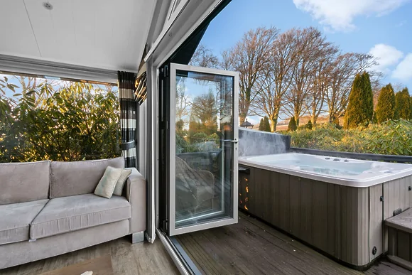 Churchill Lodge at Kentisbury Grange is a contemporary two-bedroom lodge in Devon's countryside on the edge of Exmoor National Park. This modern accommodation sleeps four guests and offers private hot tub with lake views plus convenient EV charging point facilities.