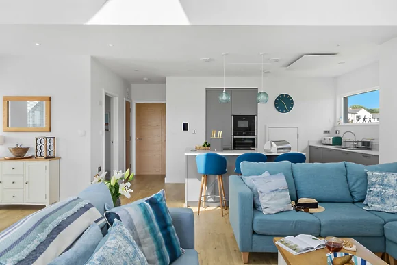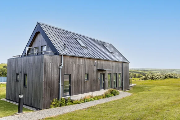 This larch-clad eco house sits in the exclusive Willingcott development in Devon. No.4 The Vista sleeps 8 guests across 4 bedrooms and 3 bathrooms. Just 2 miles from Woolacombe Beach, this modern property combines countryside peace with coastal access. The open-plan living space flows seamlessly onto a private decking terrace.