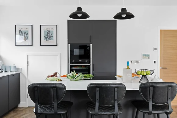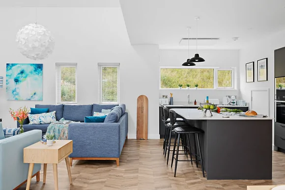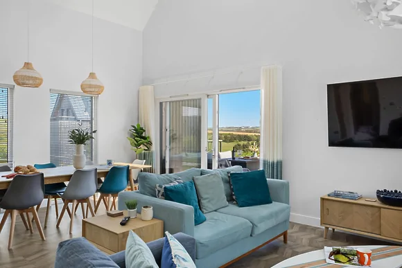 Inside you'll find an open-plan living space with contemporary kitchen, dining area for eight and corner sofa seating. Ground floor has a king bedroom with en-suite plus twin room. Upstairs features another king bedroom with private balcony and countryside views, plus a second twin room. There's also a family bathroom with bath and separate ground floor shower room.