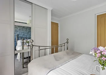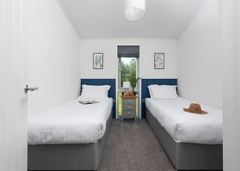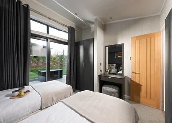 This two-bedroom lodge sleeps four guests comfortably. The master bedroom features a king-size bed with walk-in wardrobes and en-suite with oversize shower. The second bedroom has twin beds with built-in wardrobe. The open-plan living space includes kitchen with wine fridge, dining area seating four and sitting area with Smart TV. Two allocated parking spaces include EV charging point for electric vehicles.