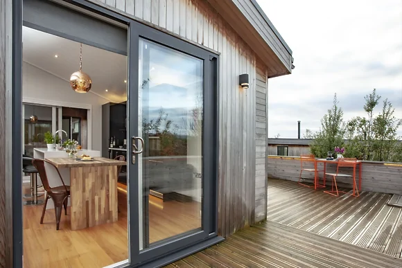 The Levels is a stunning eco lodge at Strawberryfield Park in Cheddar, Somerset. This modern single-storey retreat sleeps two guests and offers couples a peaceful escape in the Somerset countryside. The lodge features private hot tub sunken into decking and sits within a peaceful resort setting with communal parkland and small orchard access.