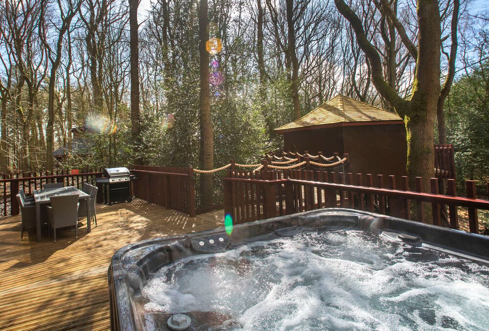 What's unique about this lodge? It’s a luxury treehouse design complete with a private outdoor hot tub.