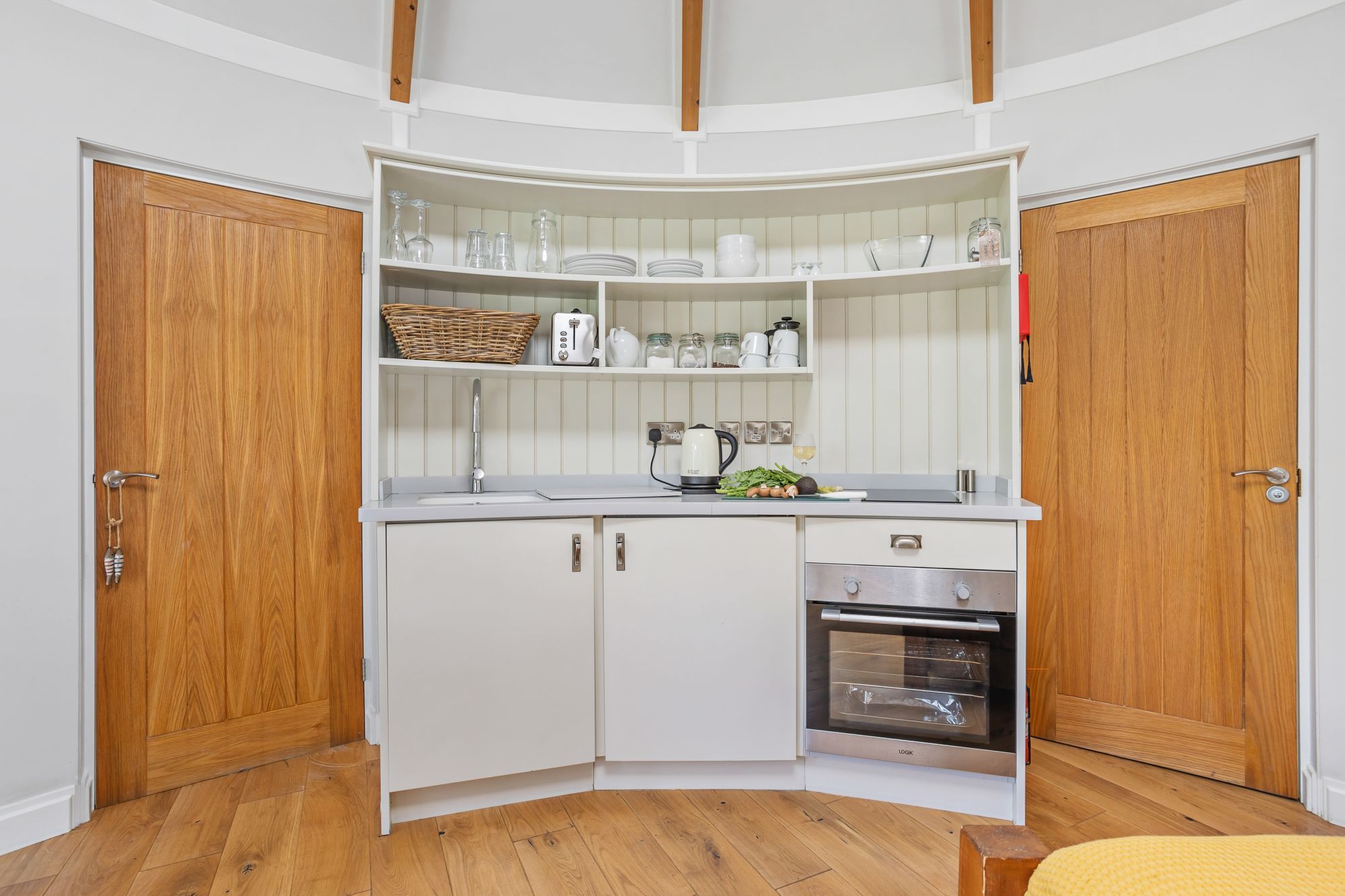 - Under-counter fridge, toaster, kettle included
