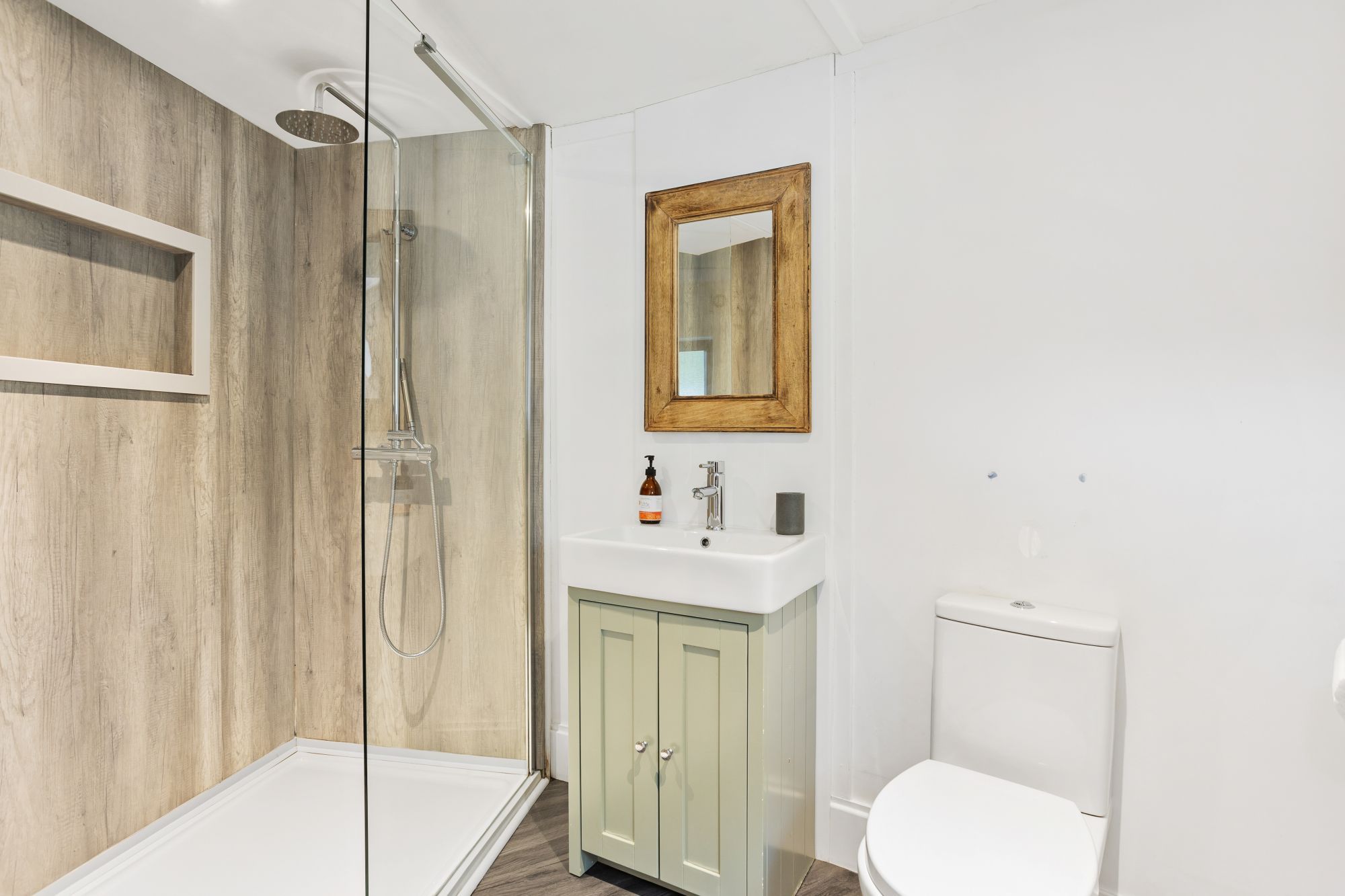 - Bathroom with walk-in shower, WC, heated towel rail and wash basin