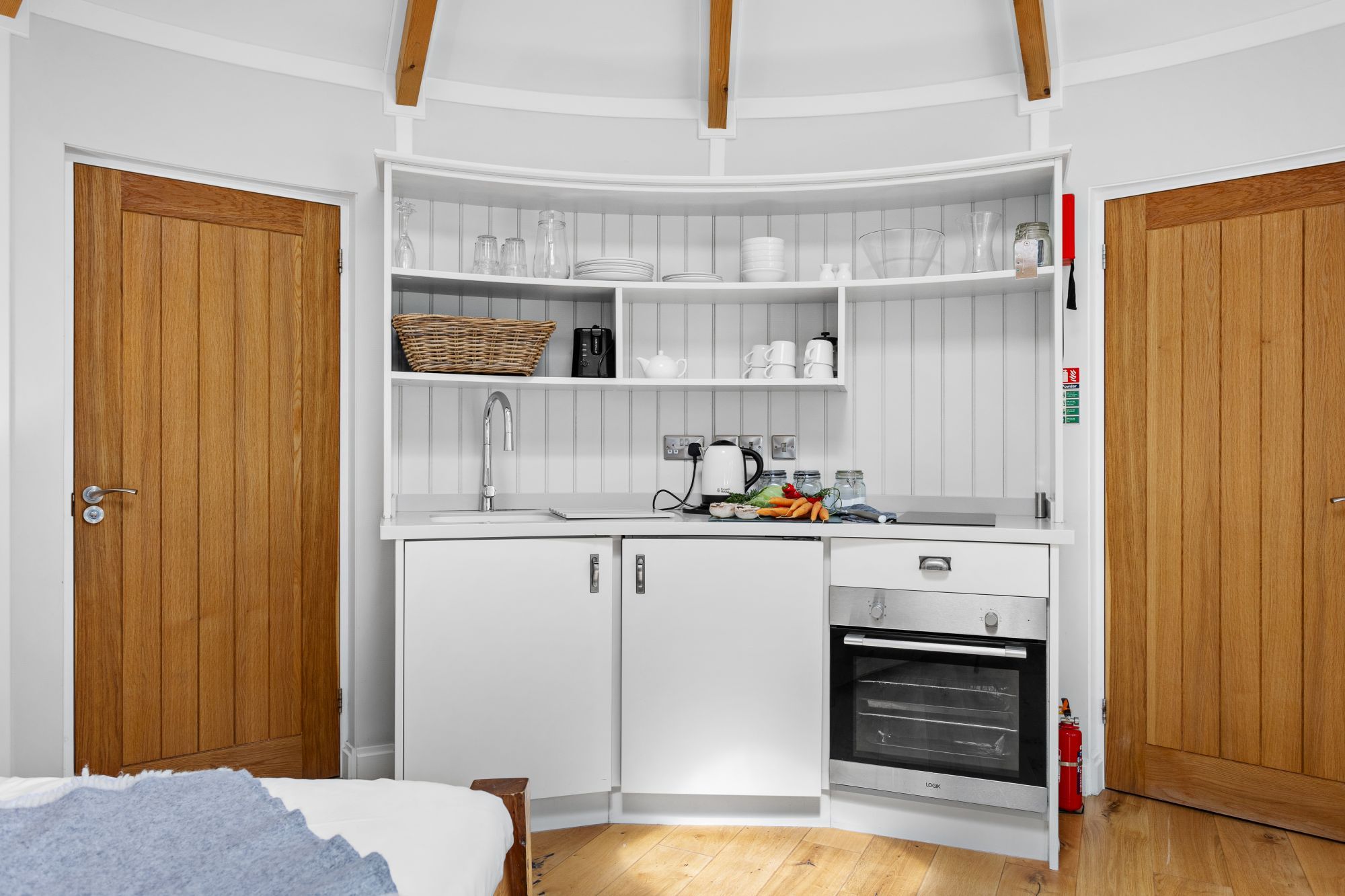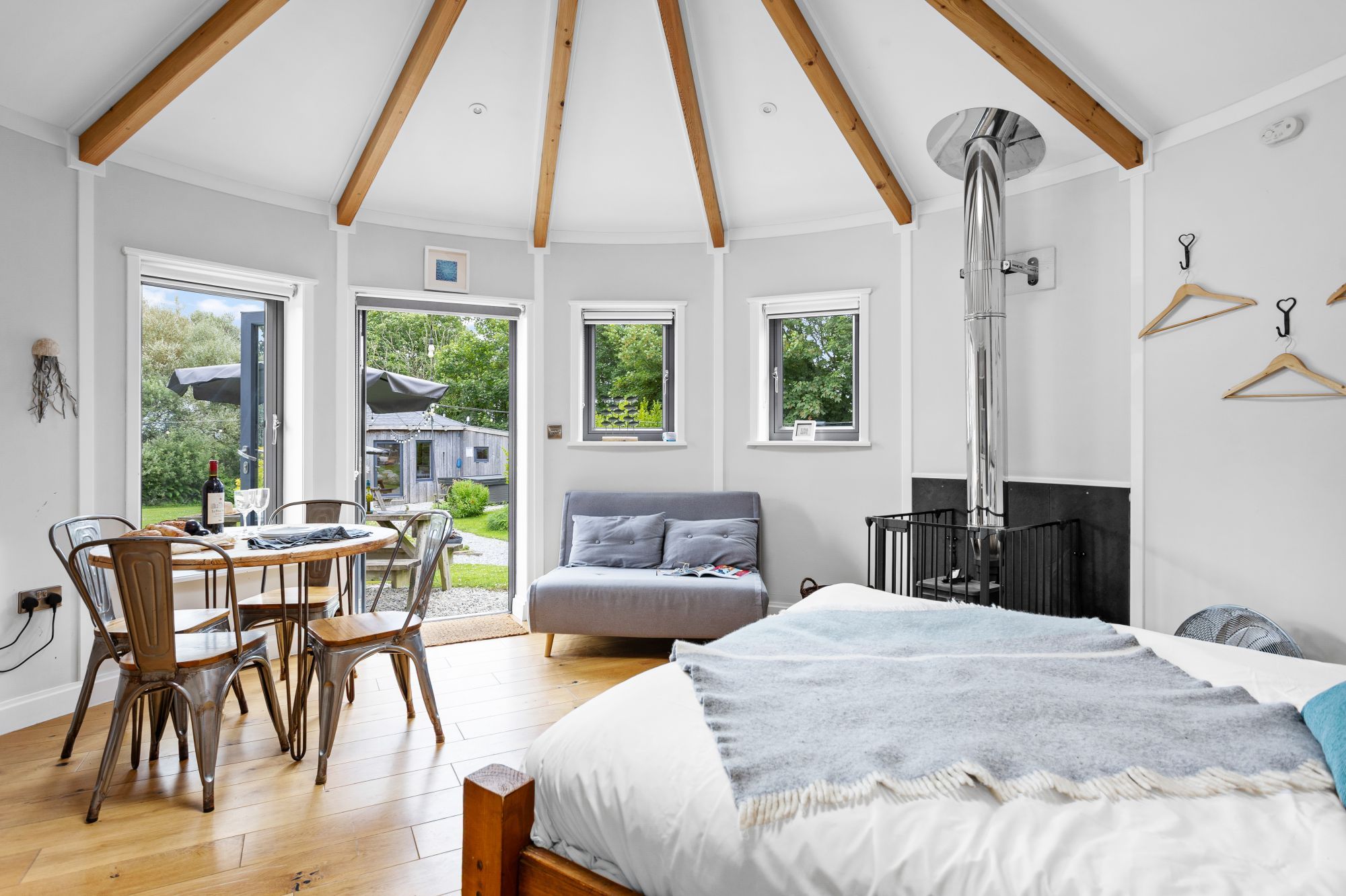 The open-plan living area features a wood burning stove with starter wood provided.