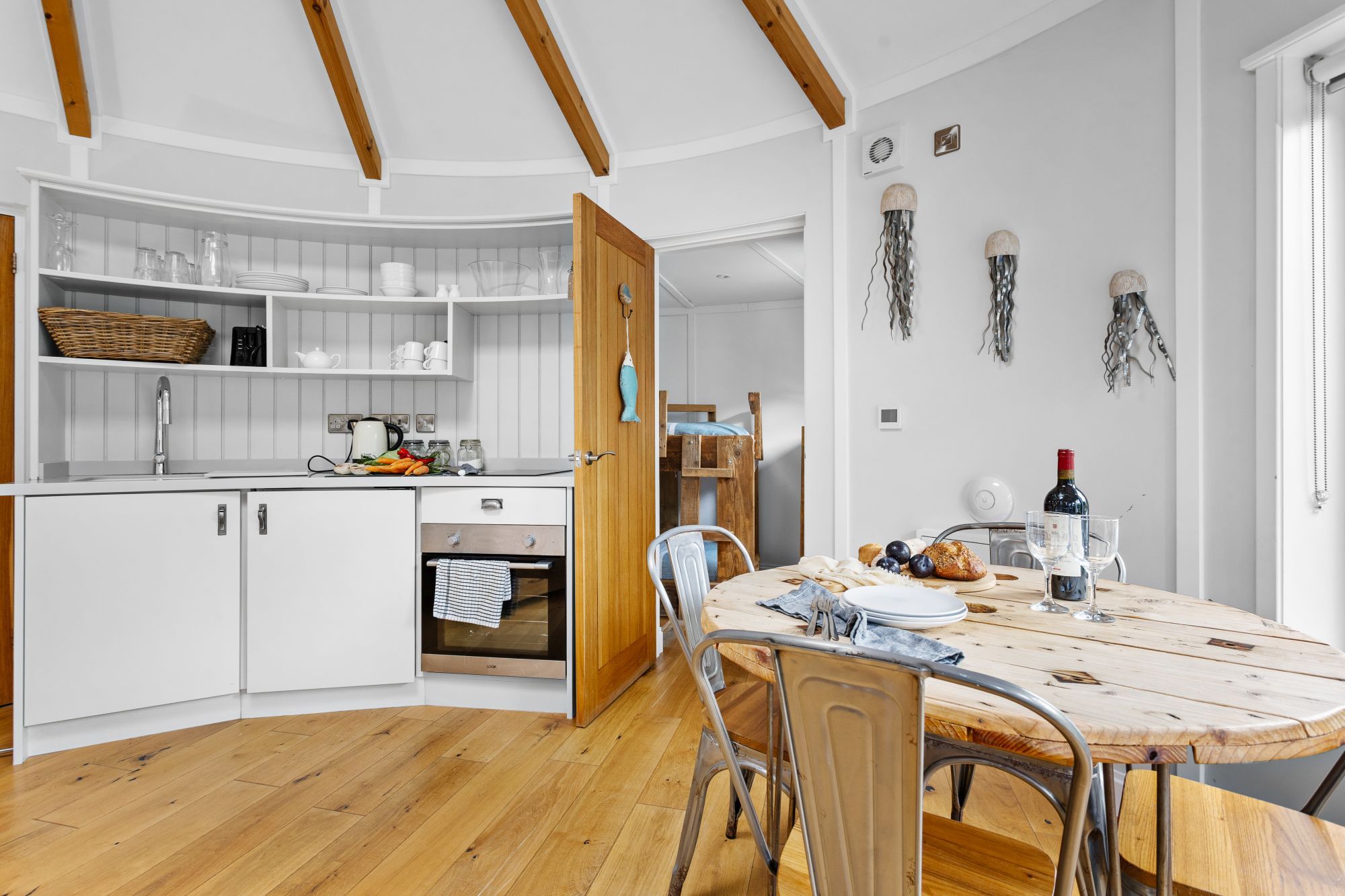 Inside you'll find two bedrooms - one cabin-style double with storm lanterns and candles, plus single bunk beds in the second room.