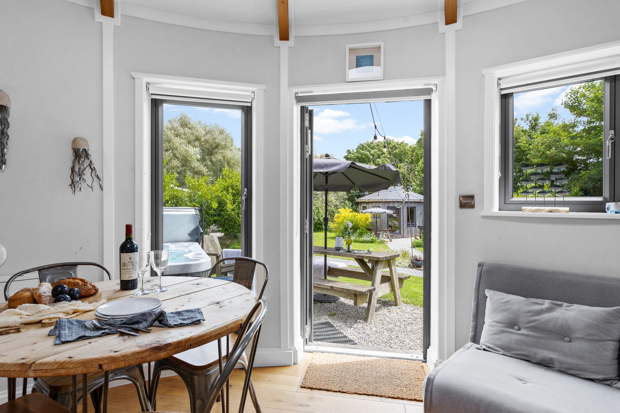 The Fern Leaf Roundhouse sleeps 4 guests and comes with a private hot tub with privacy screen - perfect for evening soaks after beach days.