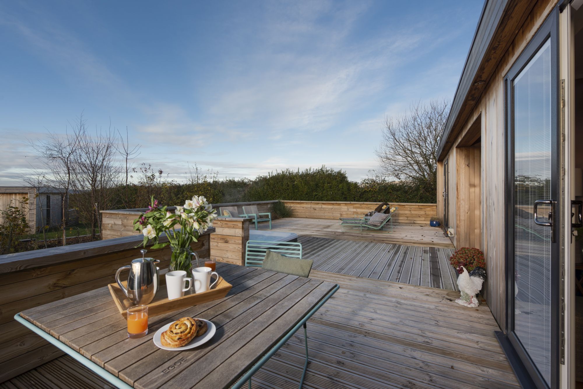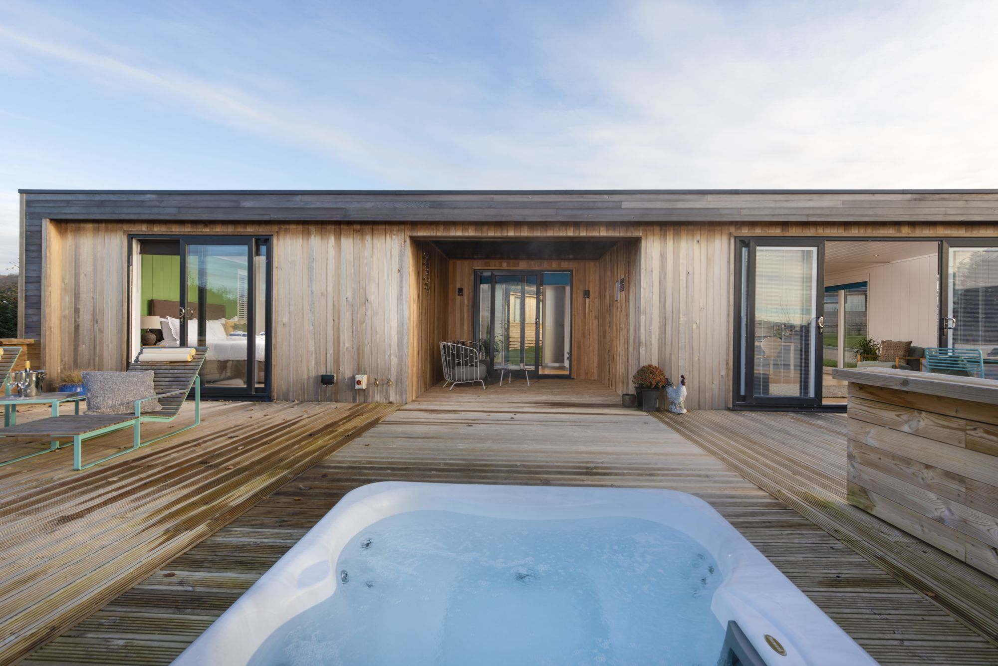 This couples retreat sleeps two in complete luxury with private hot tub partially sunken into the decking.