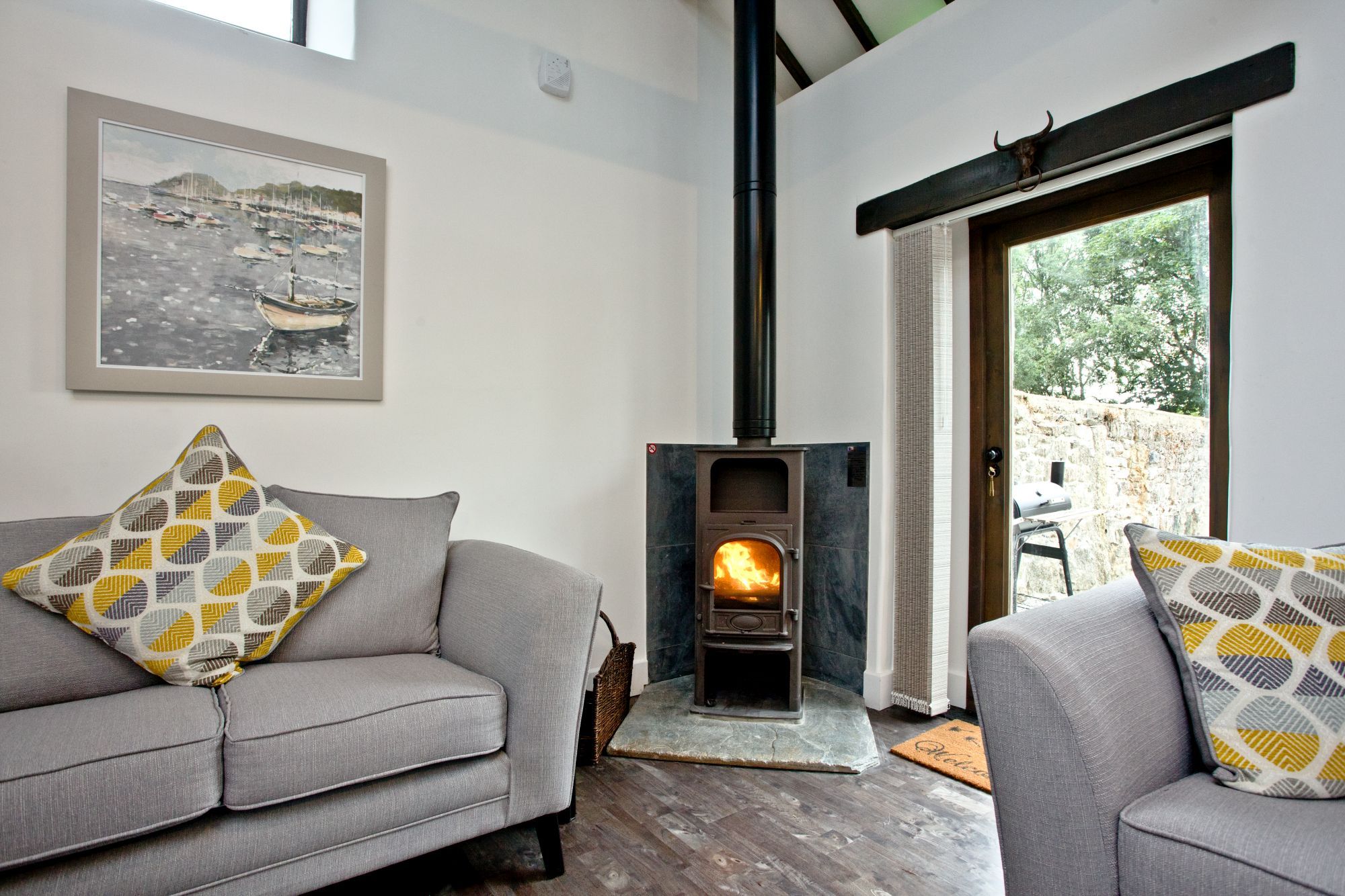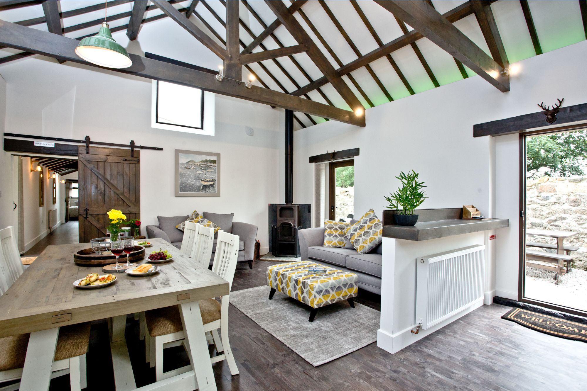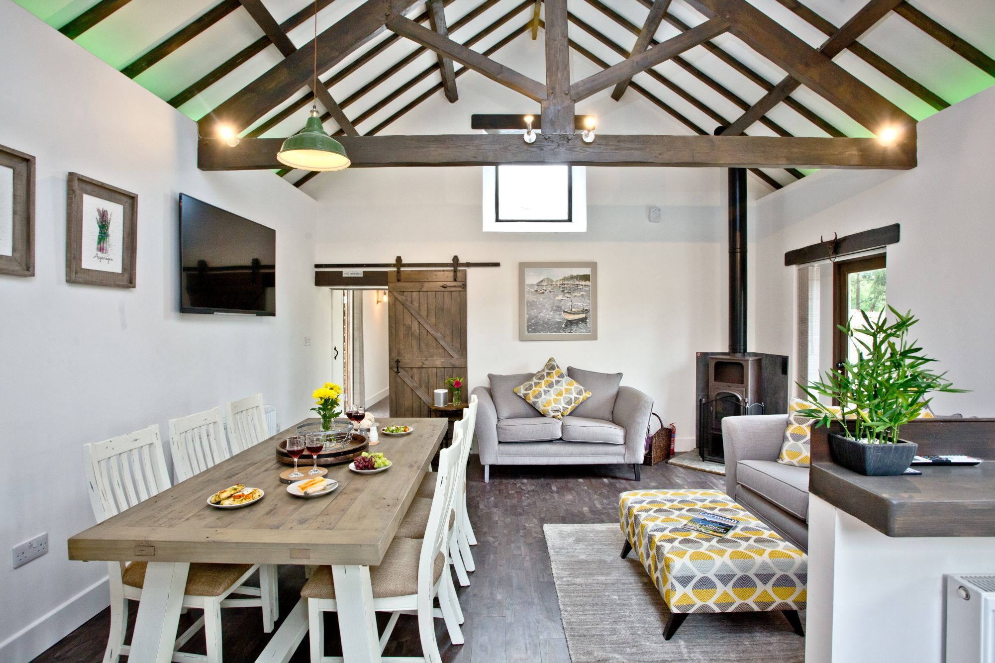 • Open-plan living area with 2 sofas and wood burning stove