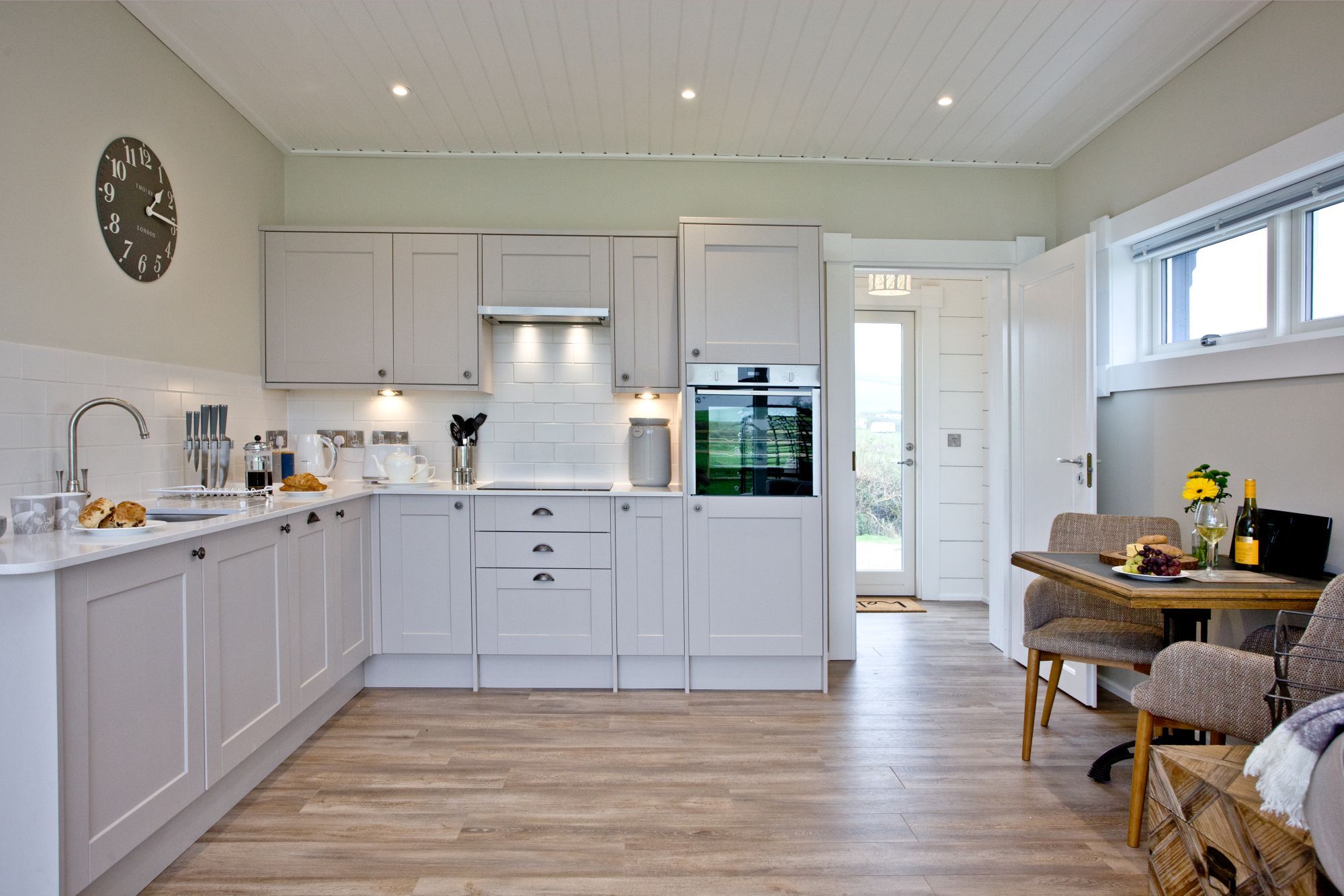 The lodge features an open-plan living space with kitchen, dining area and sitting room.
