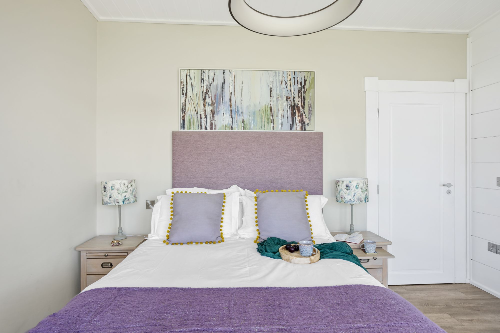 This luxury one-bedroom lodge sleeps two people and features floor-to-ceiling windows that frame countryside views.
