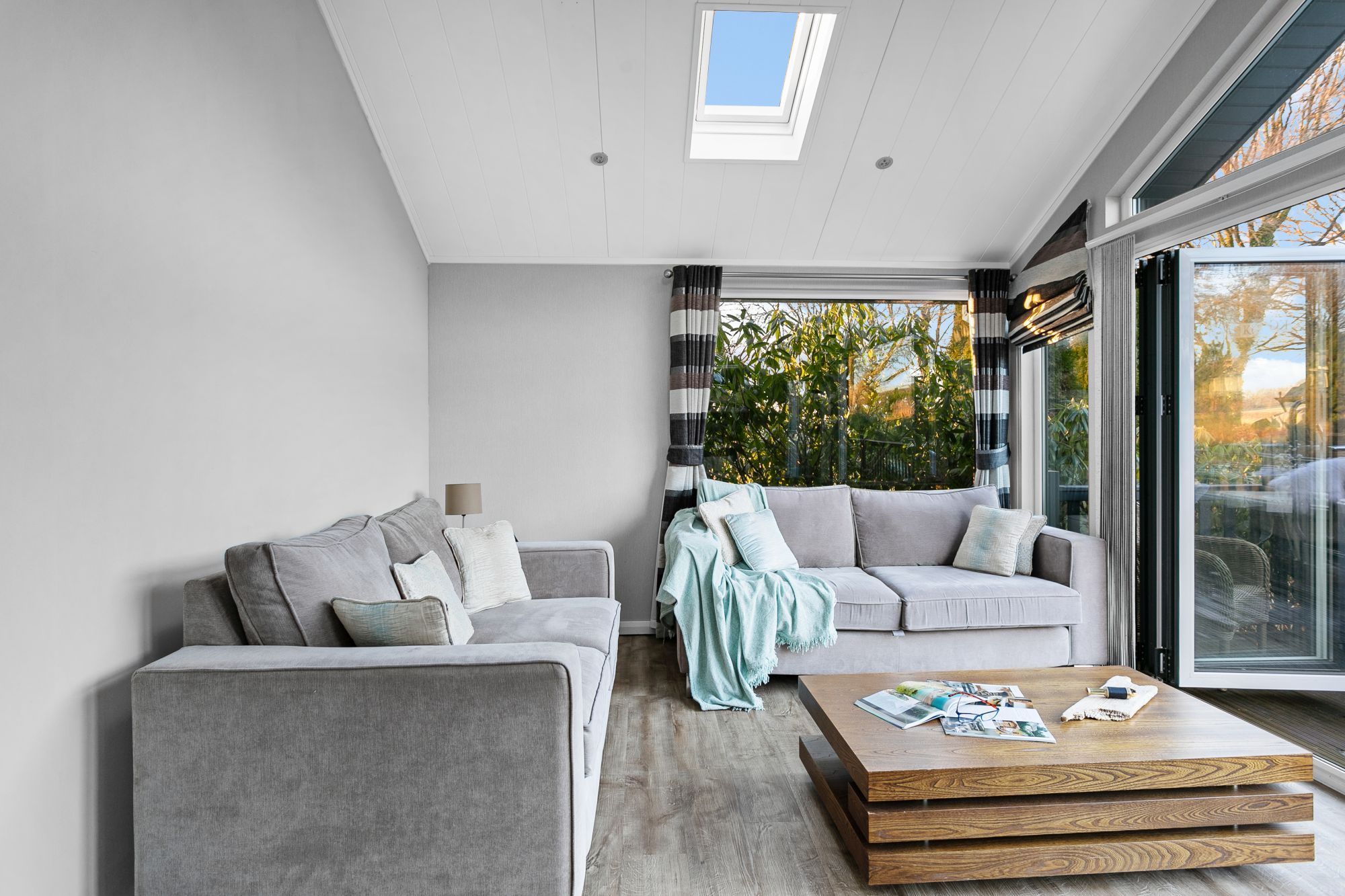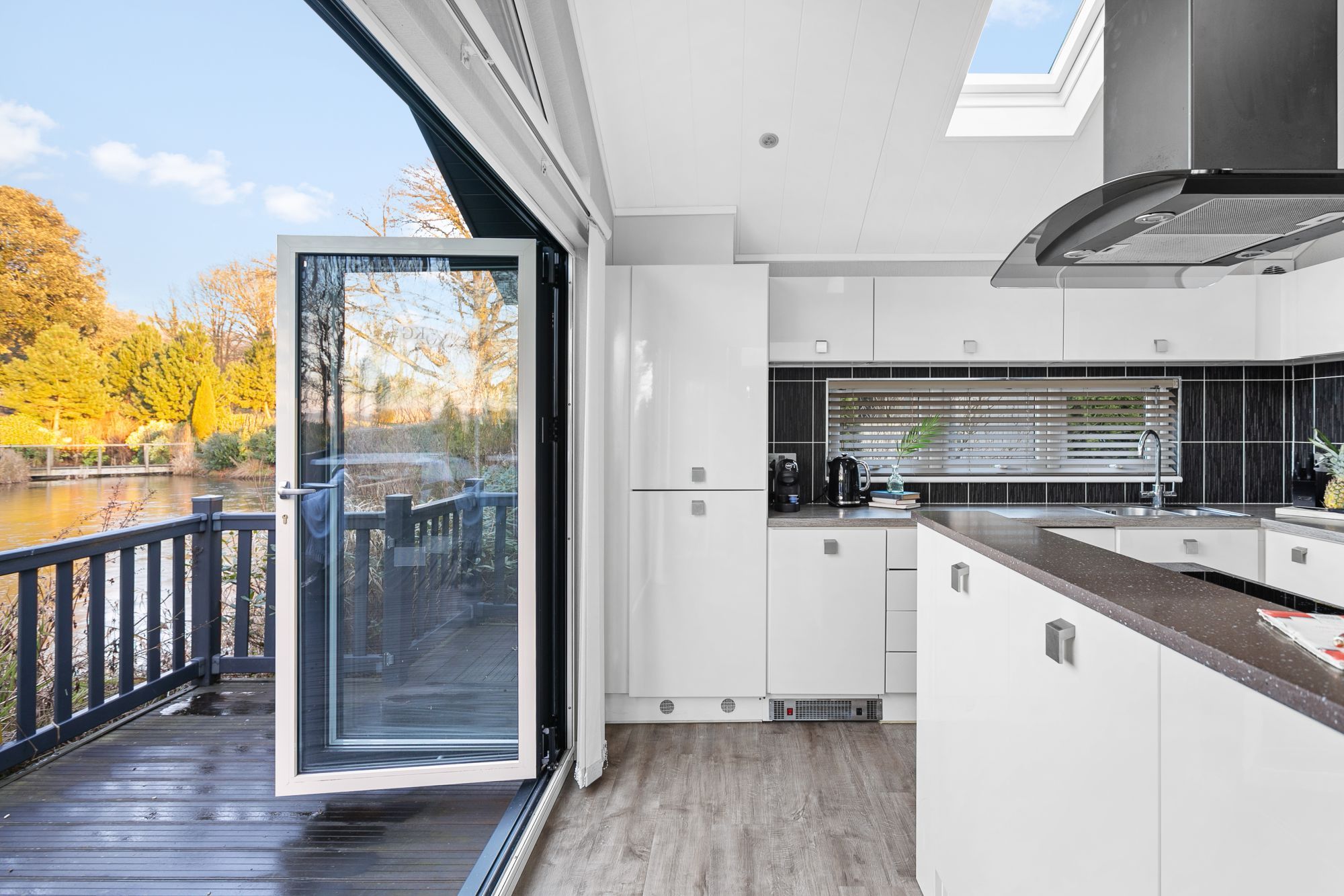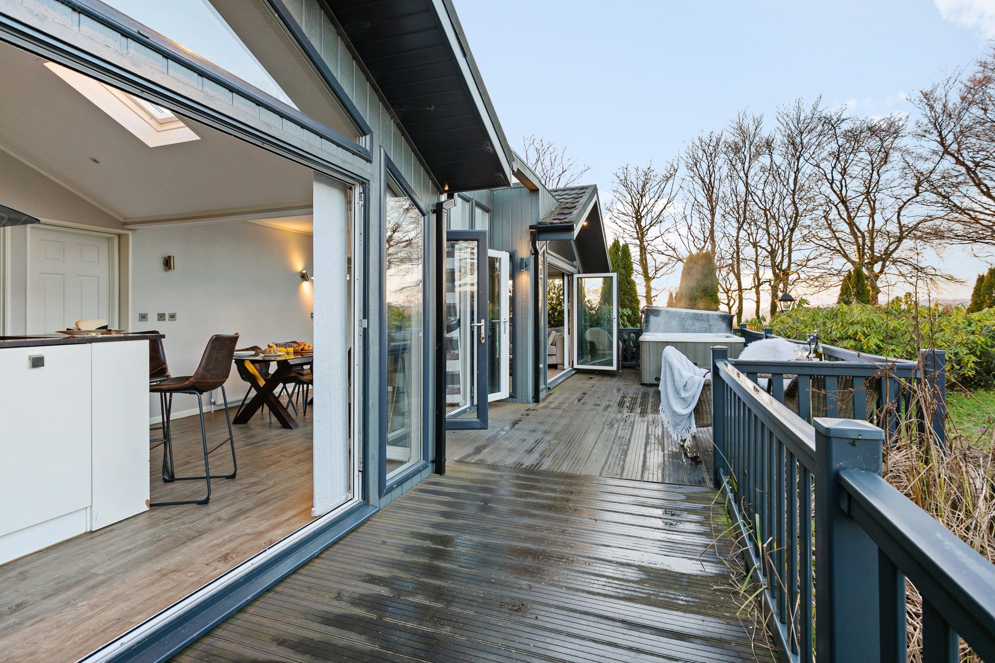 - Open-plan living/dining/kitchen area with bifold doors to deck