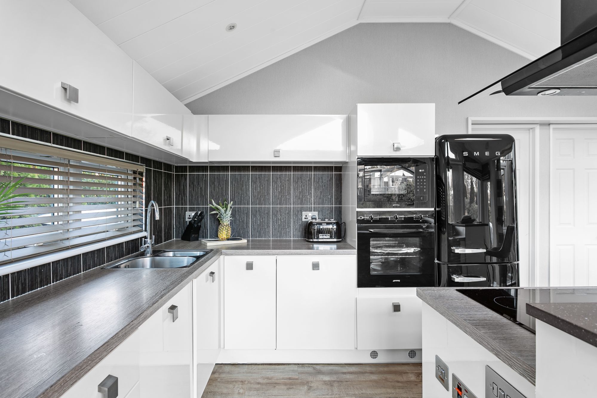 Inside you'll find an open-plan living space with Smeg kitchen appliances and bifold doors opening onto the deck.