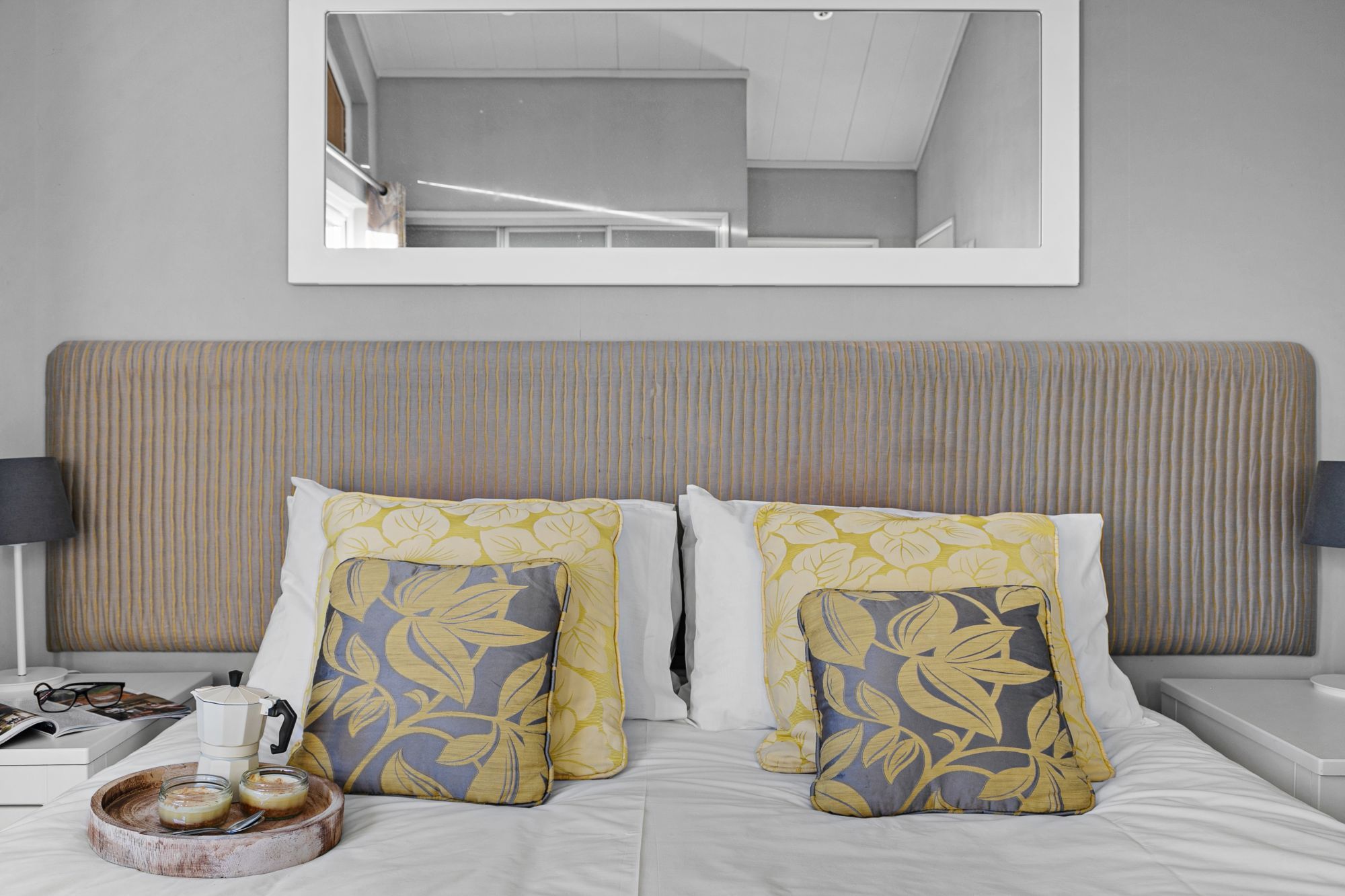 - Two bedrooms: 1 x king-size with garden views and en-suite shower, 1 x twin (configurable as double) with en-suite
