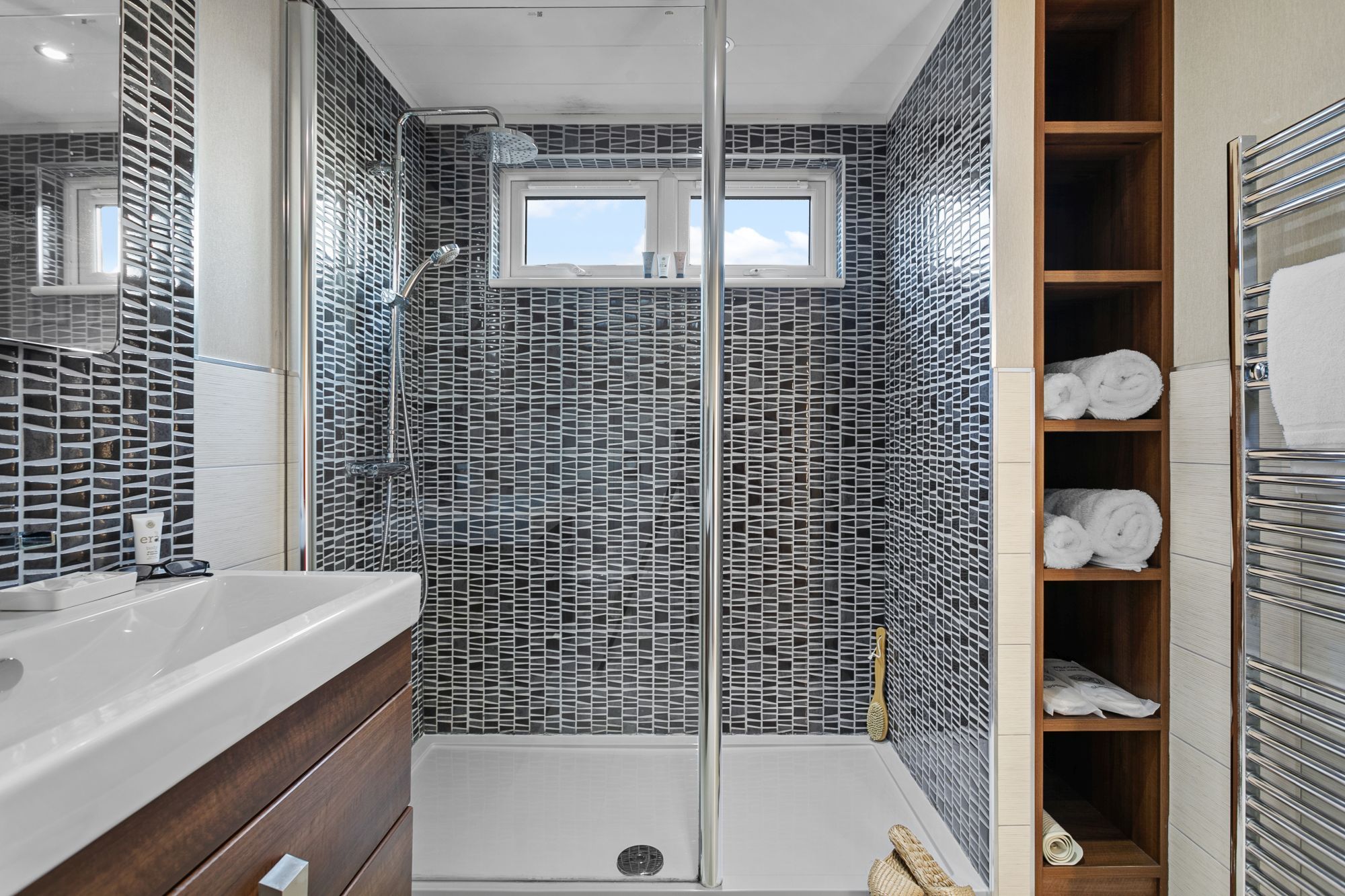 - Master bedroom en-suite with large walk-in shower, basin, heated towel rail and WC