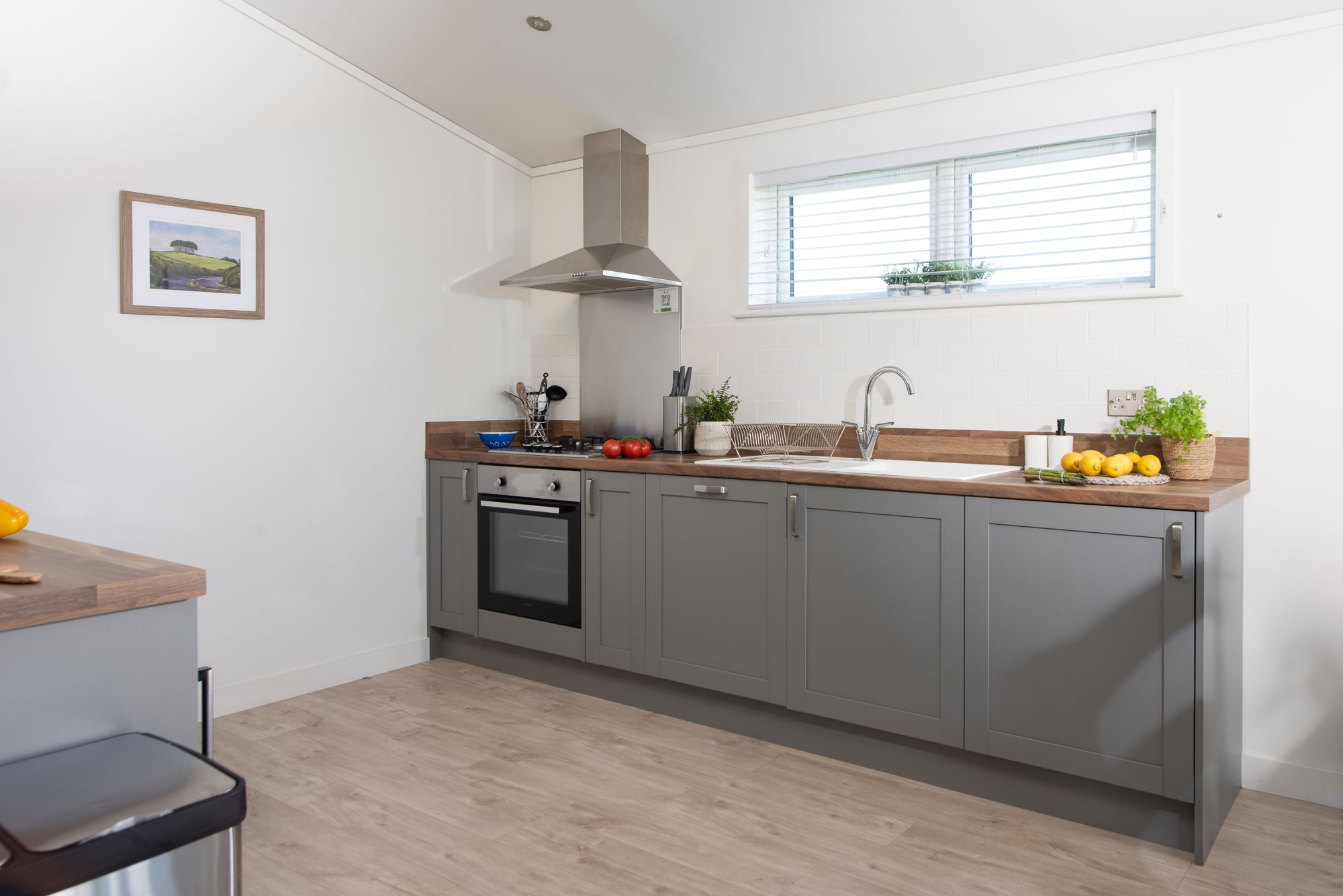 The property features Shaker-style kitchen units and an electric flame-effect log burner for cosy evenings.