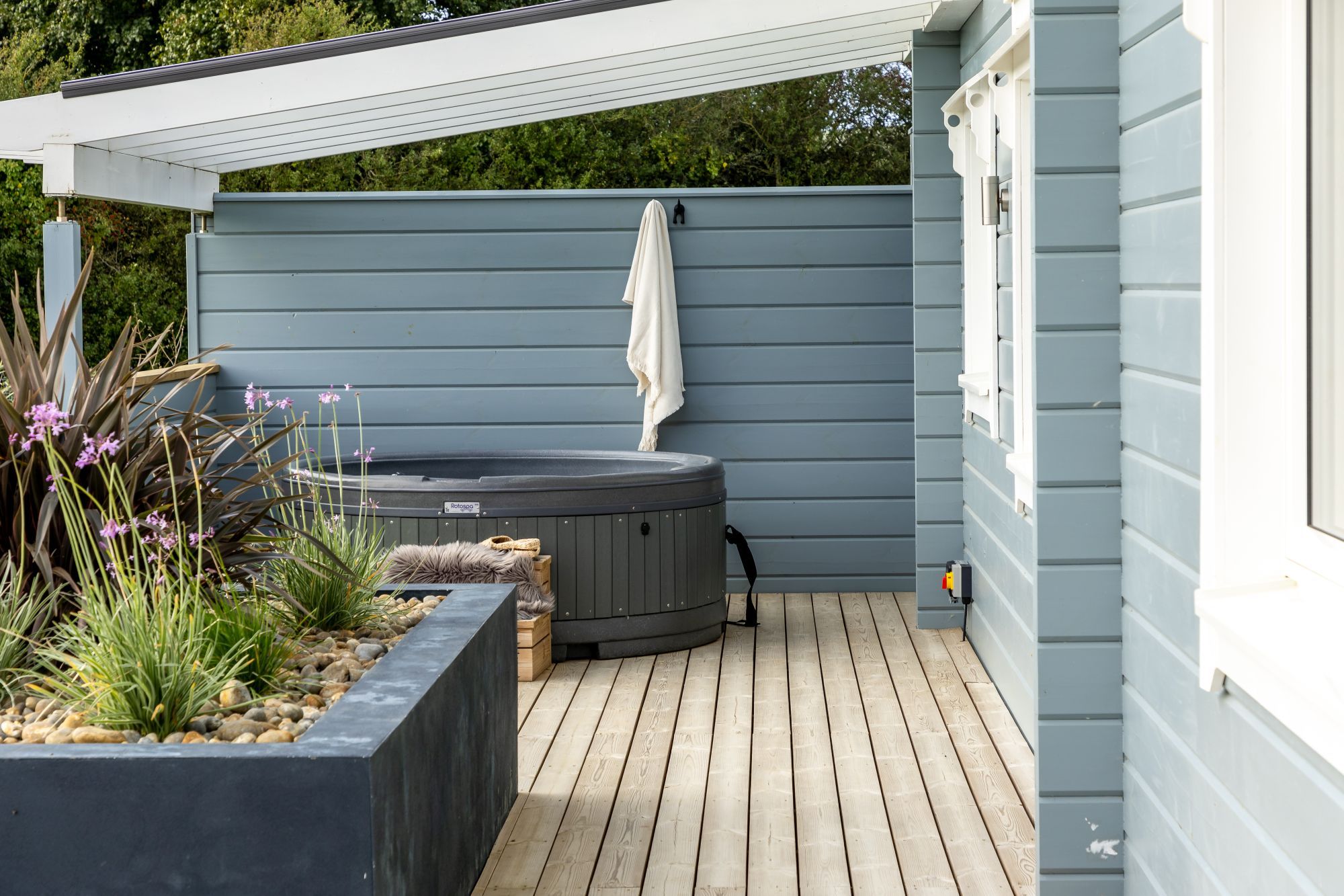 This modern retreat features a covered hot tub with glass roof and sits within easy reach of some of Devon's most spectacular coastline.