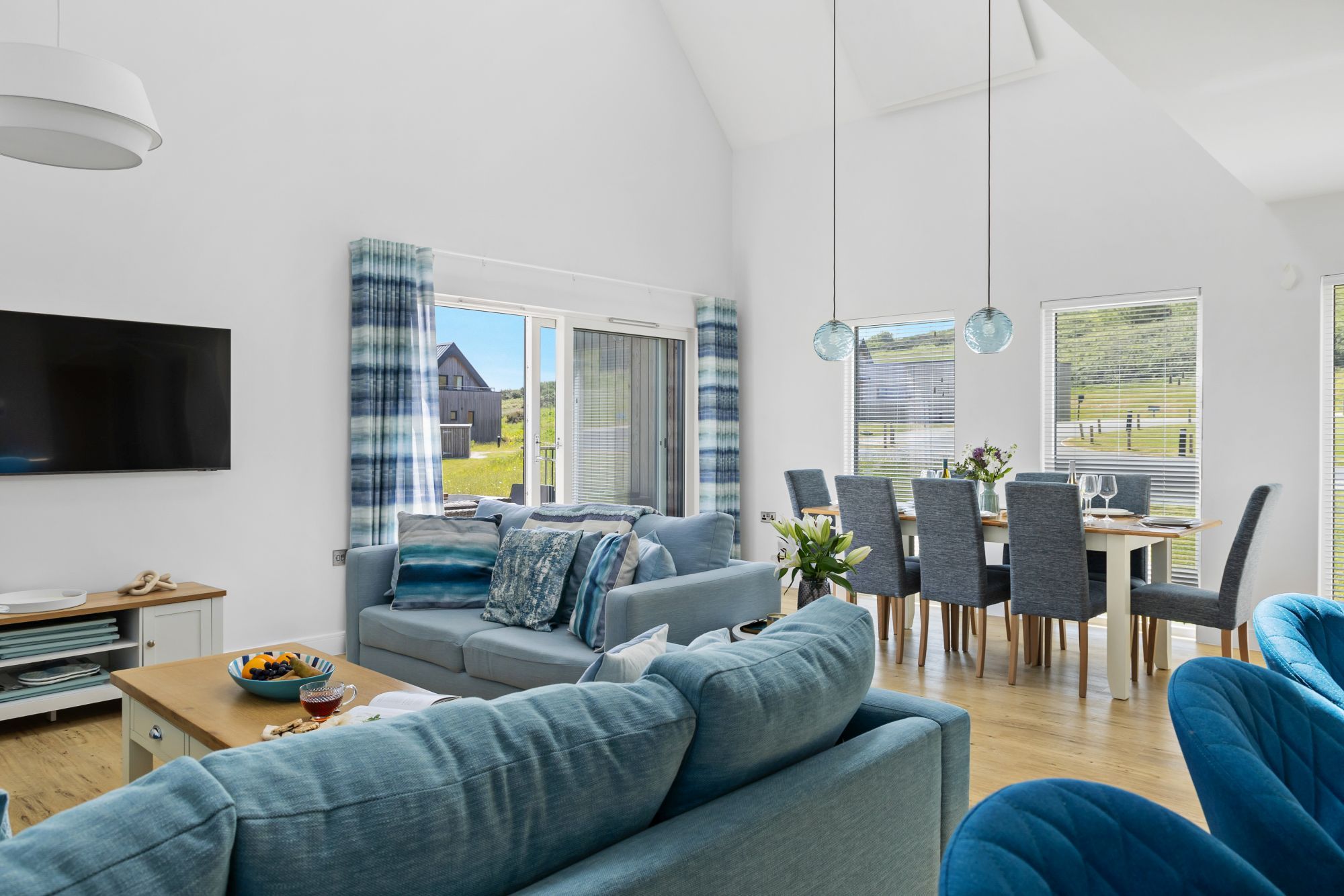 The open-plan living space flows seamlessly onto a private decking terrace.