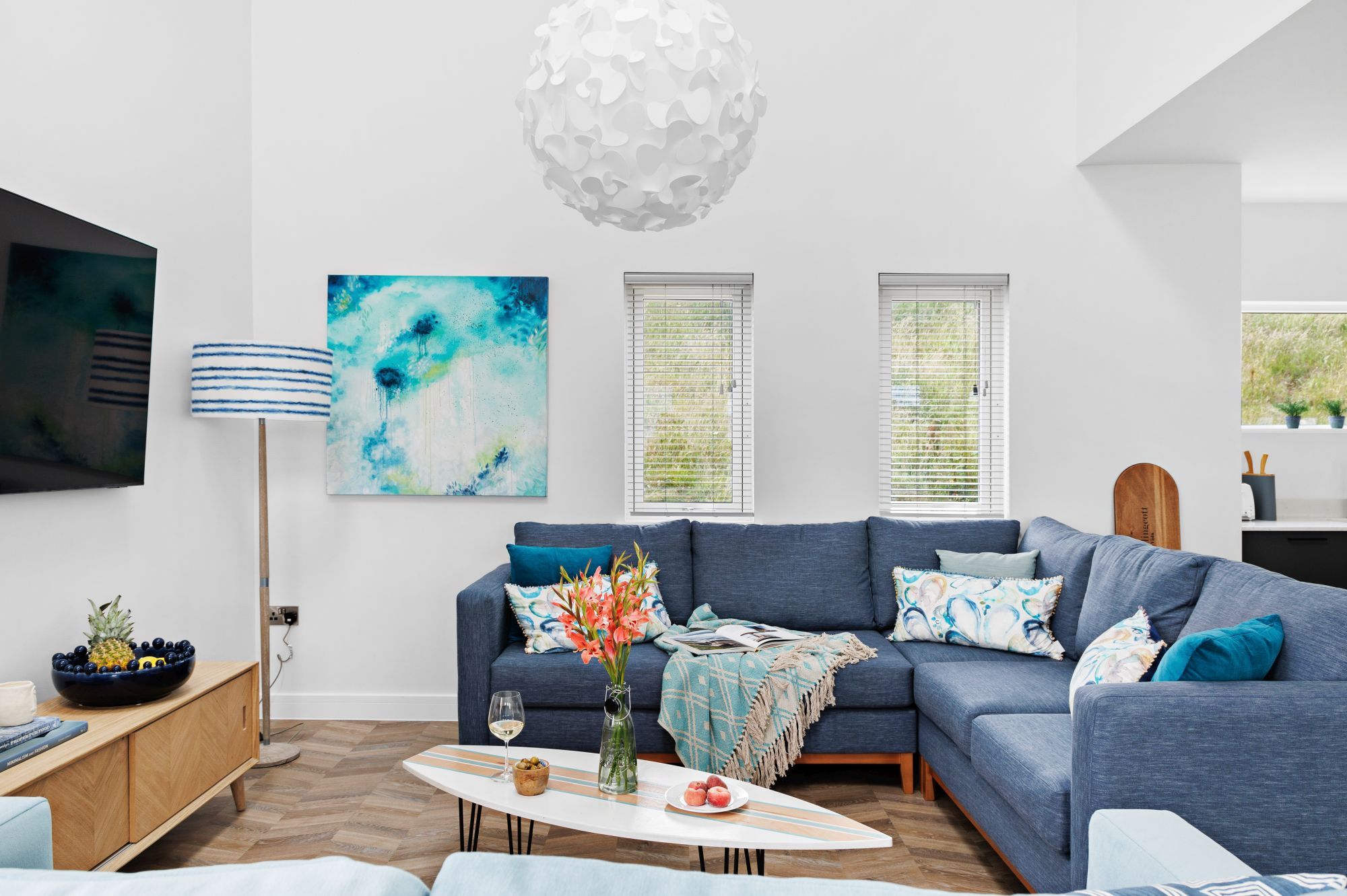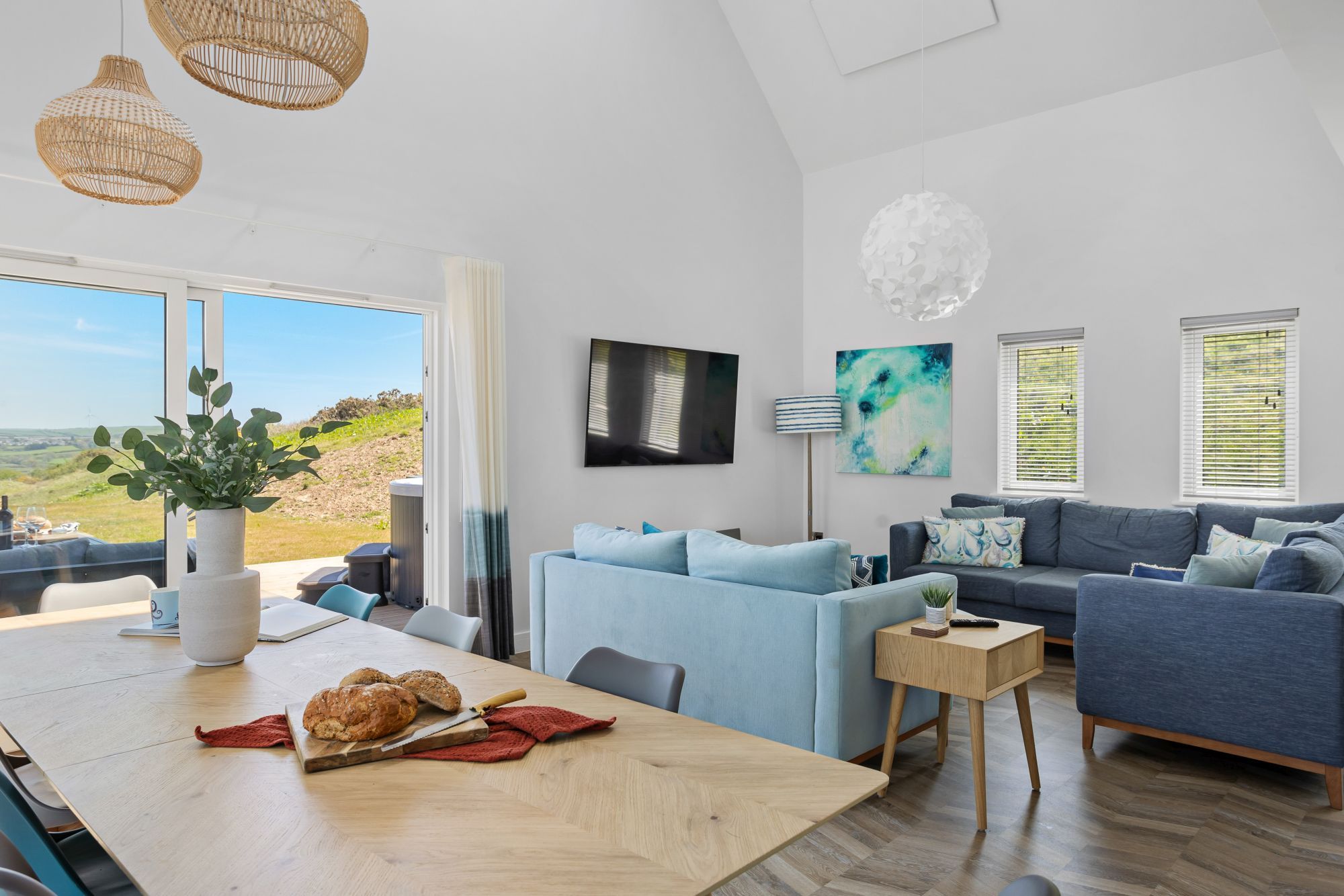 Inside you'll find an open-plan living space with contemporary kitchen, dining area for eight and corner sofa seating.