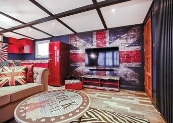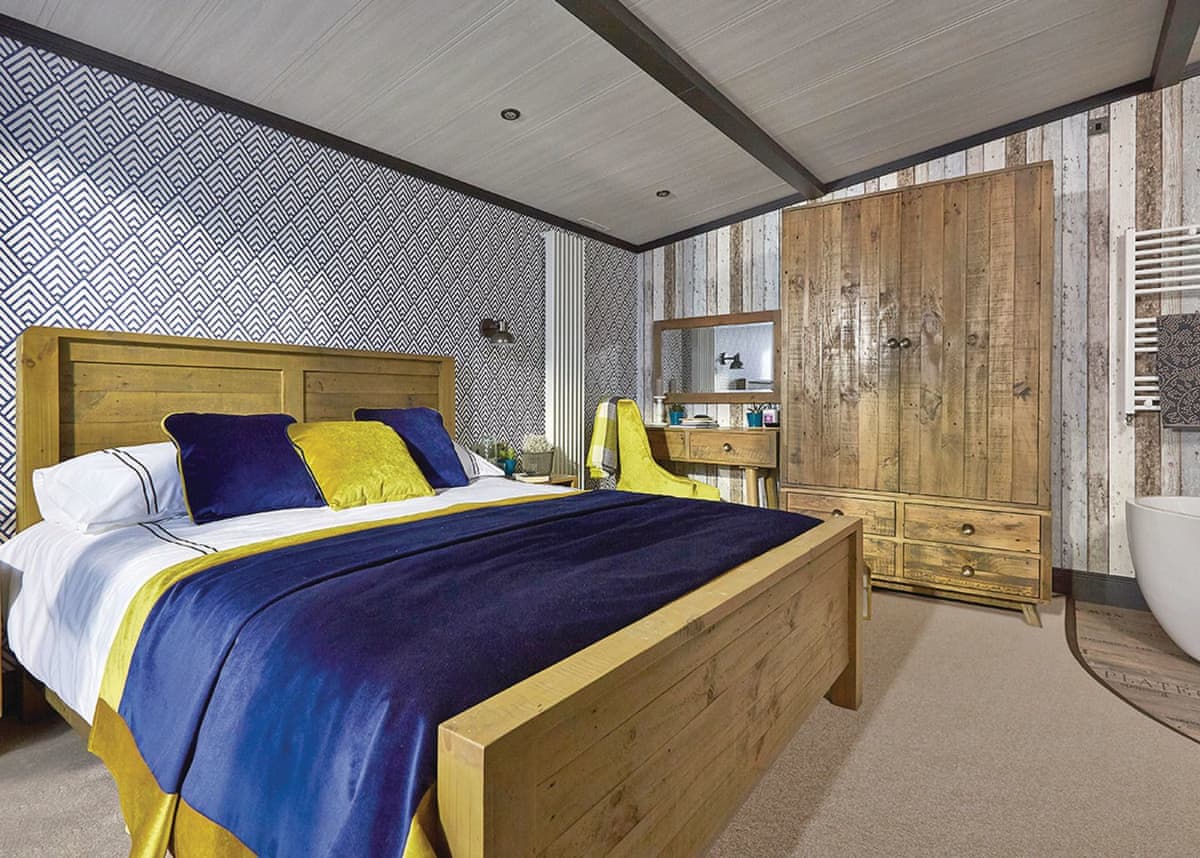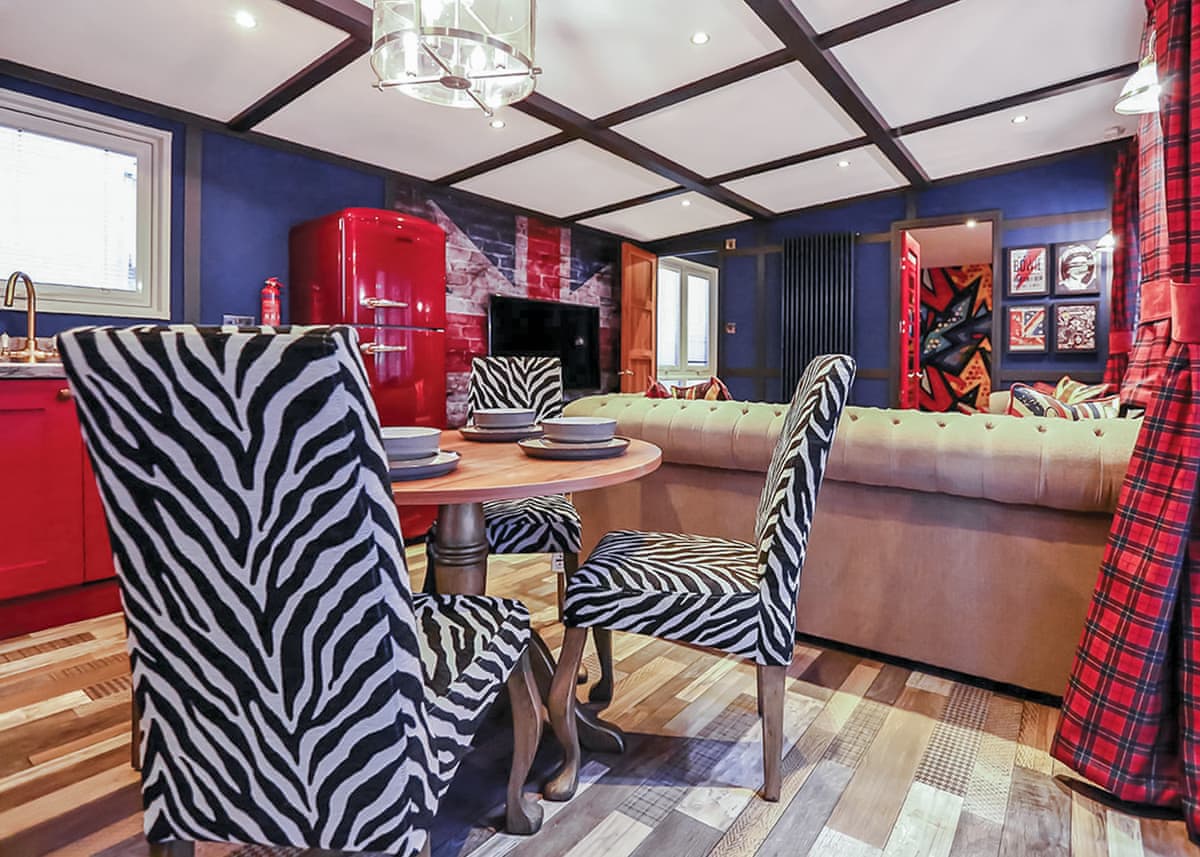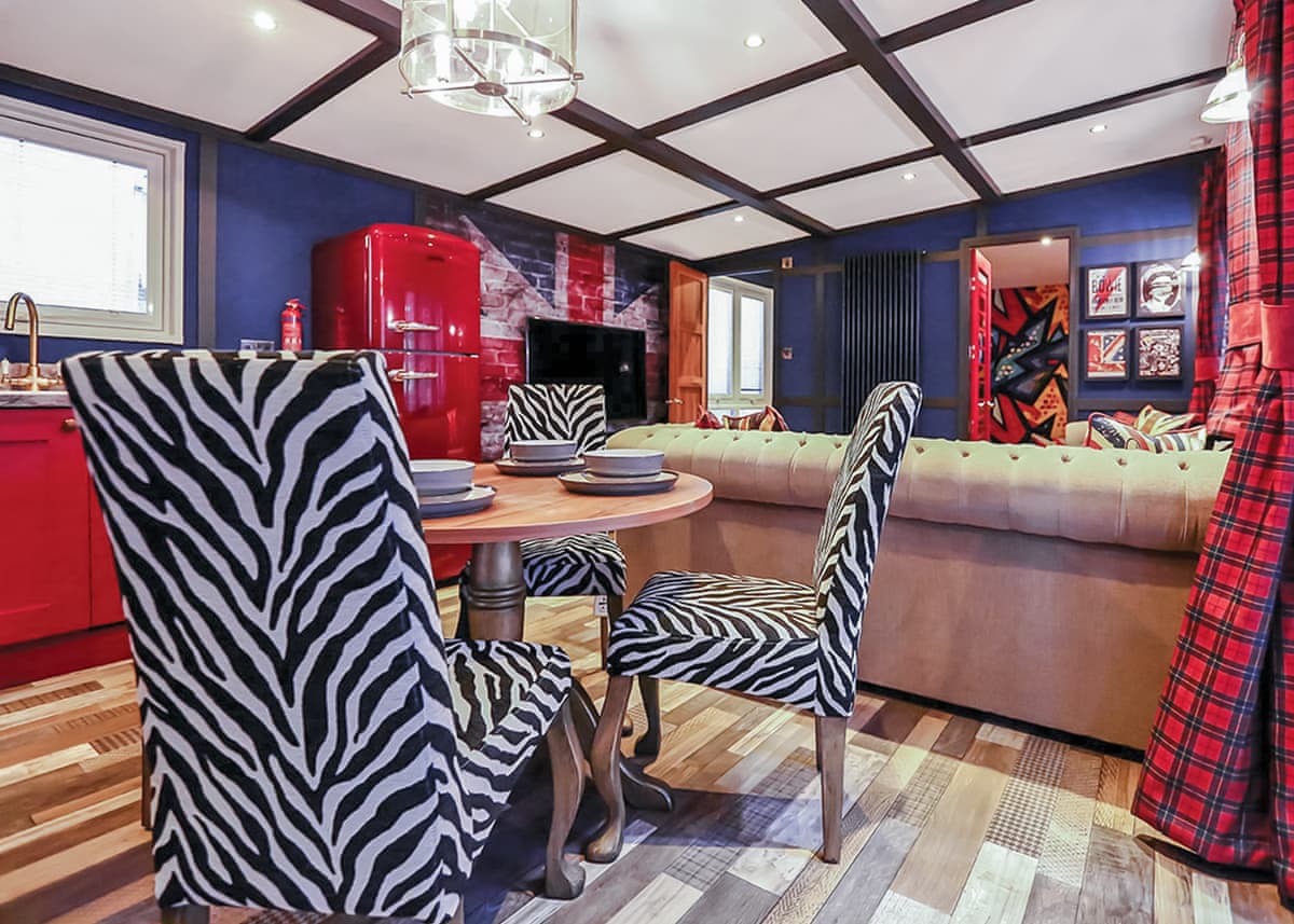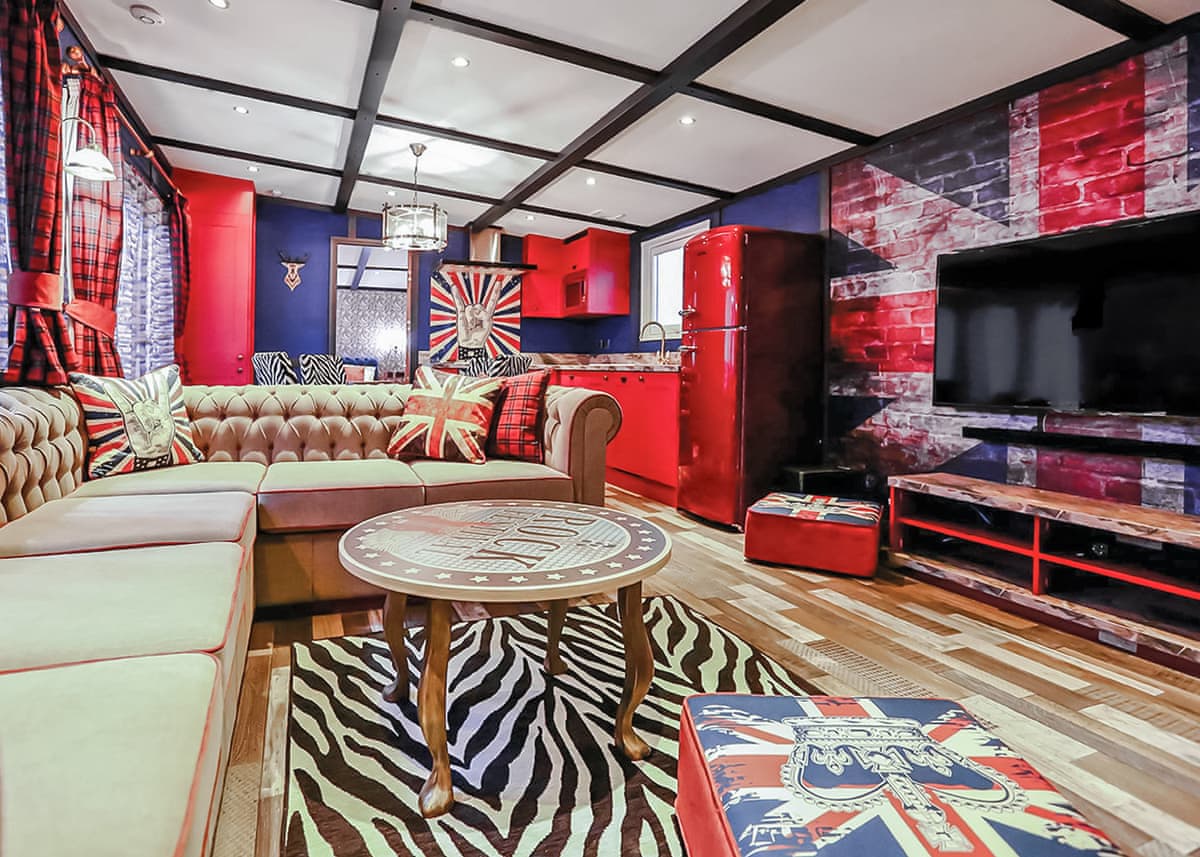 For something a little different, the Indulgent Rockstar VIP lodge has a stylish interior with colourful red, white and blue décor throughout, and a Union Jack painted onto the exposed brick wall in the living area.