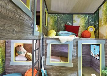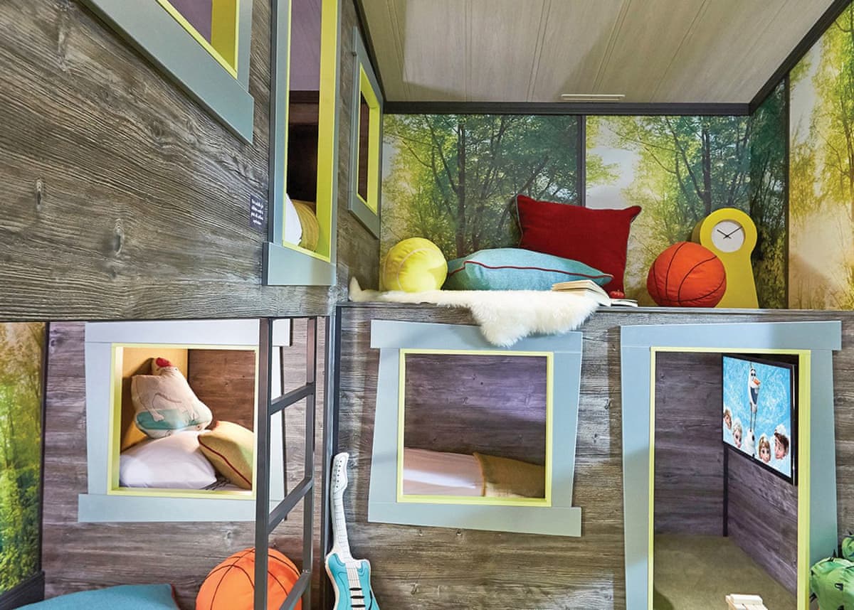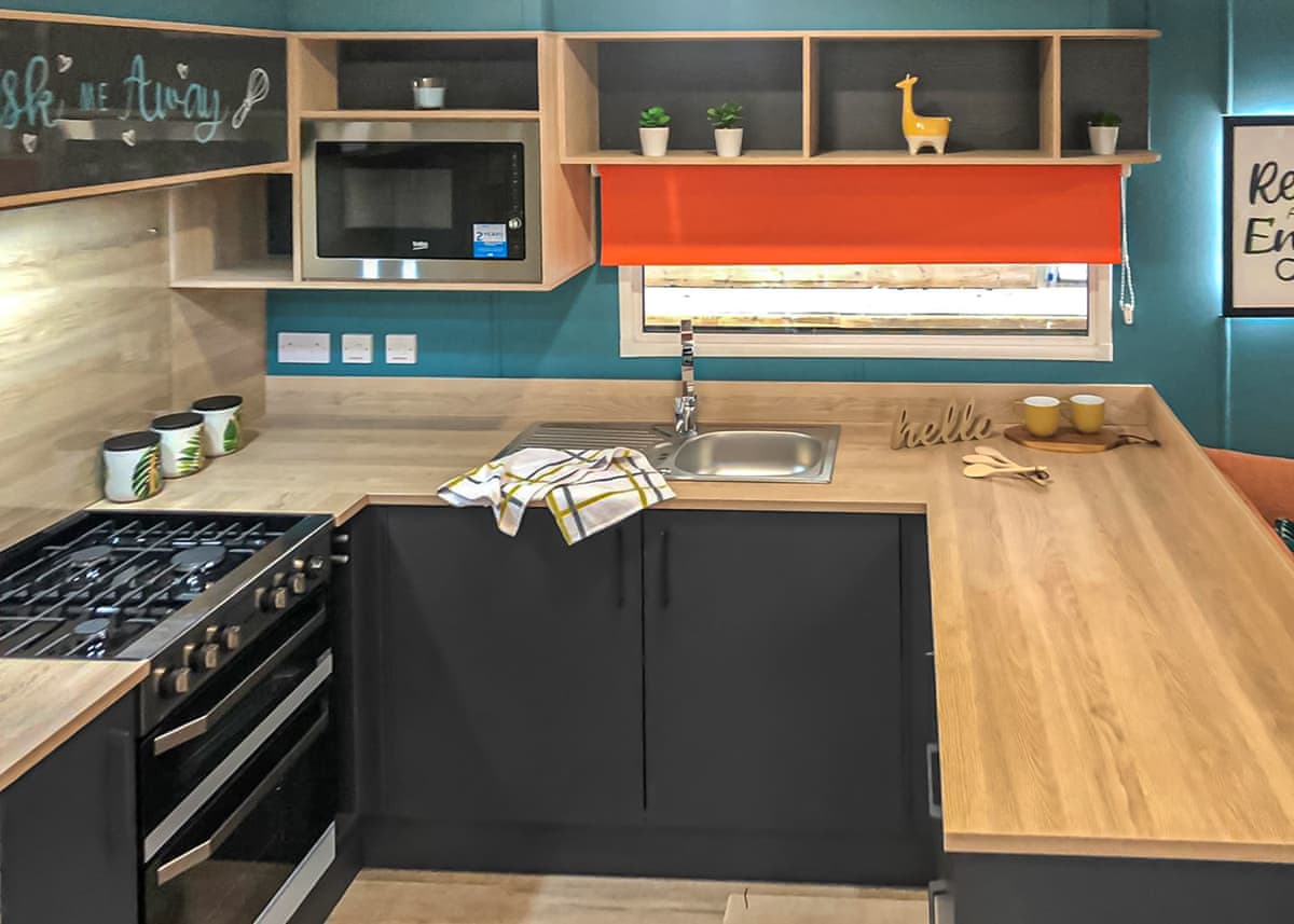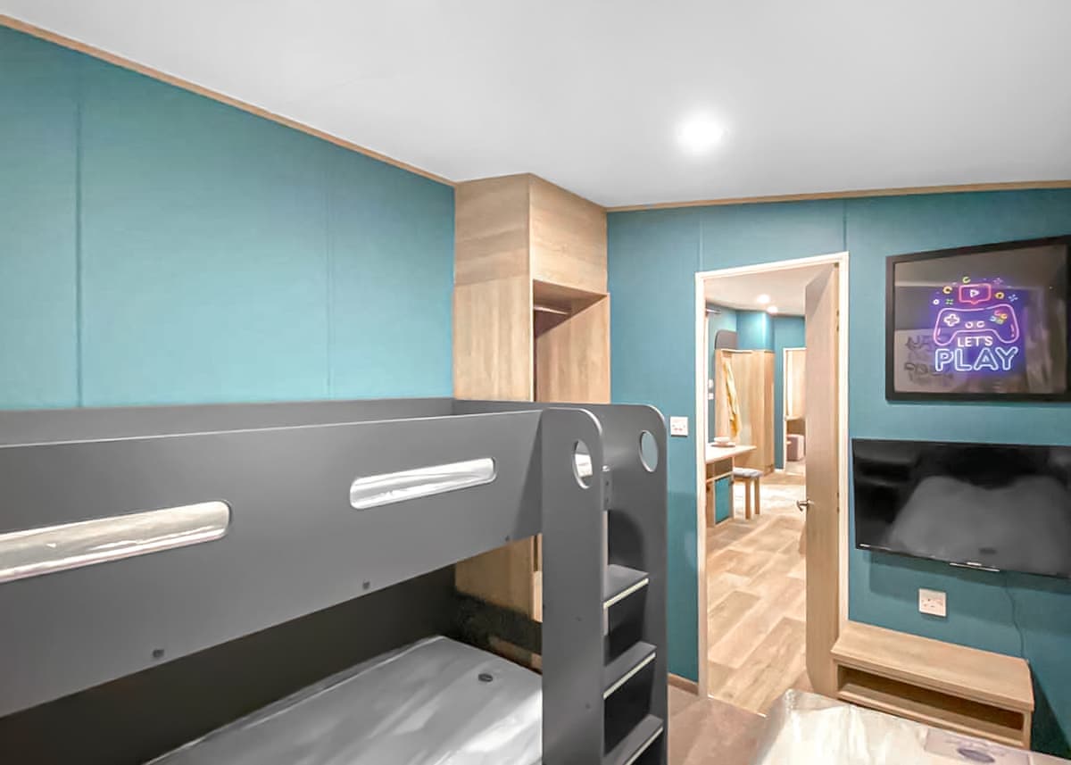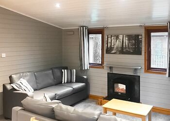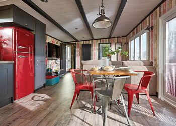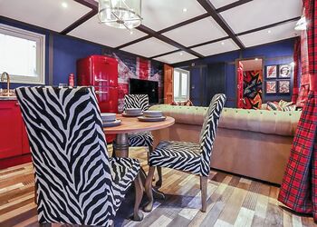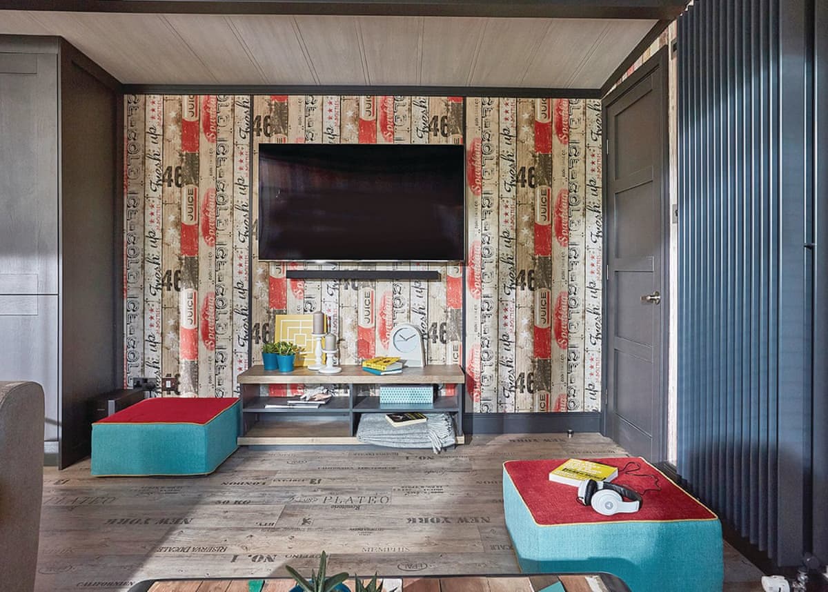 For something a little different, the Indulgent Rockstar VIP lodge has a stylish interior with colourful red, white and blue décor throughout, and a Union Jack painted onto the exposed brick wall in the living area.