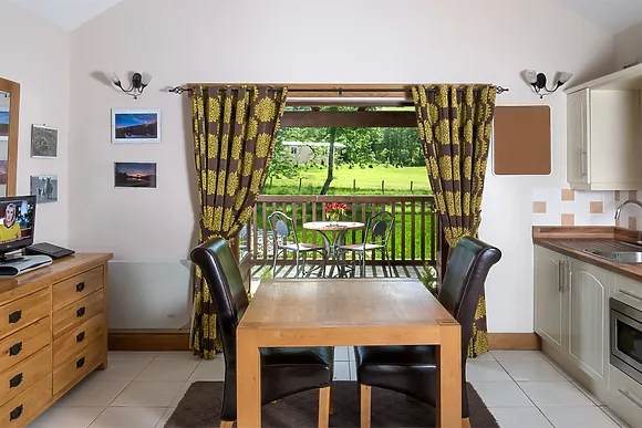 The lodge features an open-plan layout with a double bed tucked into an alcove. There's a compact galley kitchen with all essentials: two-ring hob, mini oven, microwave and fridge. The covered balcony is usable year-round - perfect for breakfast while watching ducks waddle by.