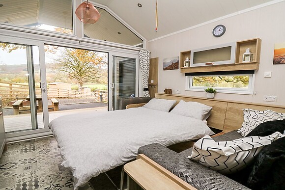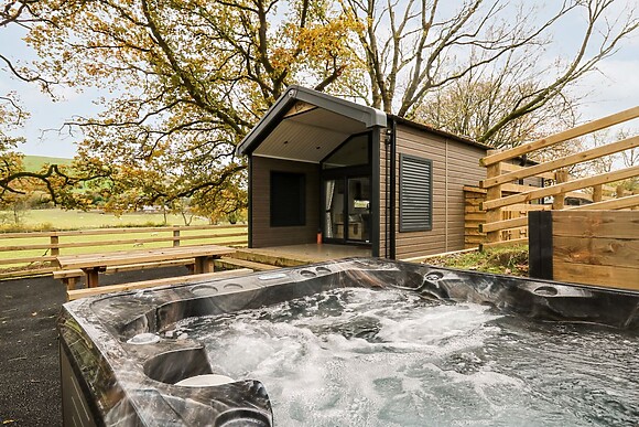 Oak Tree View is a high-end hot tub lodge you'll find in Powys, Wales. This exceptional rural retreat sits on the outskirts of Rhayader market town and is perfect for couples or groups of up to five people. The impressive floor-to-ceiling windows really make this property stand out and flood the space with natural light.